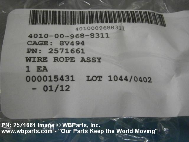 1640-00-968-8311 An assembly consisting of wire rope, with terminal attachment(s) and/or end loop(s), in a continuous run from end to end. (If without attachments, one end must terminate in a loop.) It may contain one or more intermediate and/or end attachments such as sliding or fixed ring(s), hook(s), or the like. For items specifically designed for aviation, see WIRE ROPE ASSEMBLY, SINGLE LEG, AVIATION. Excludes CONTROL ASSEMBLY, PUSH-PULL.