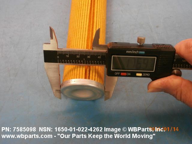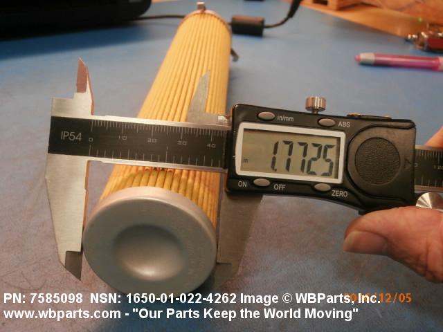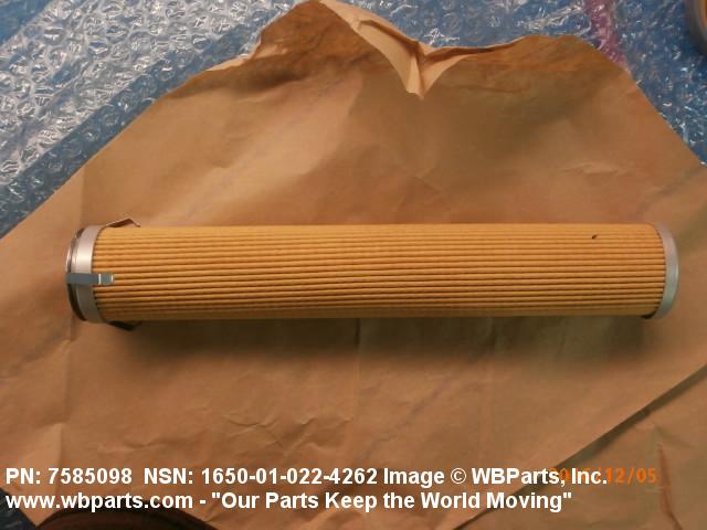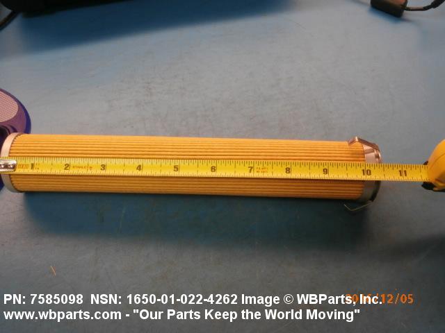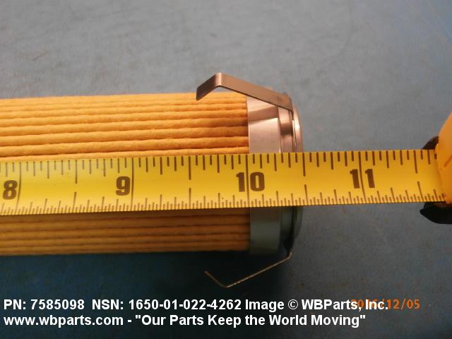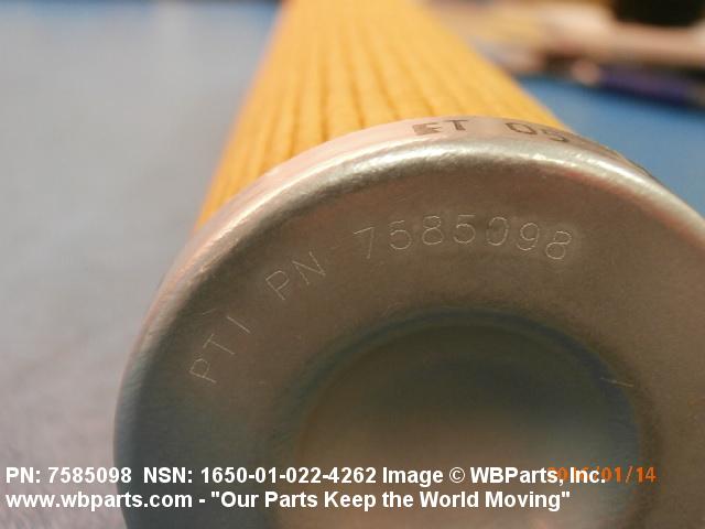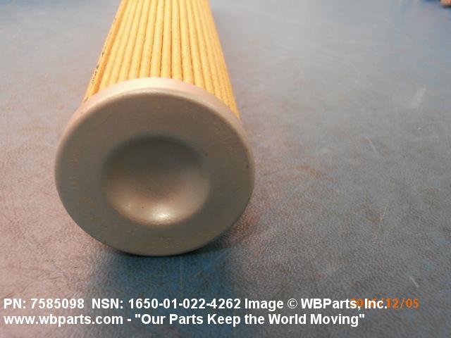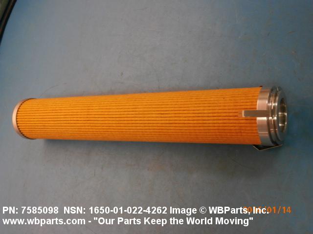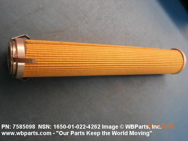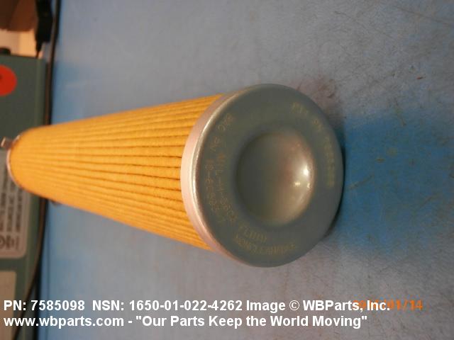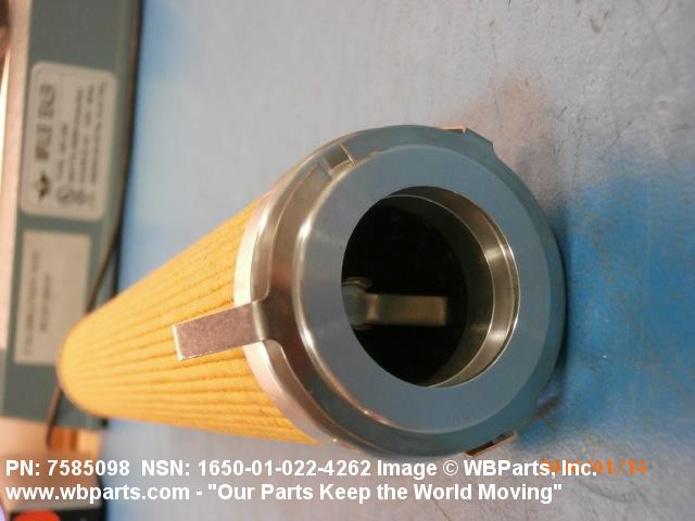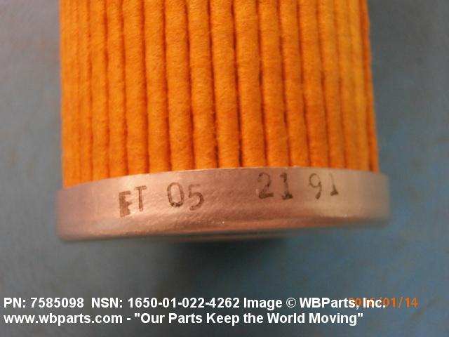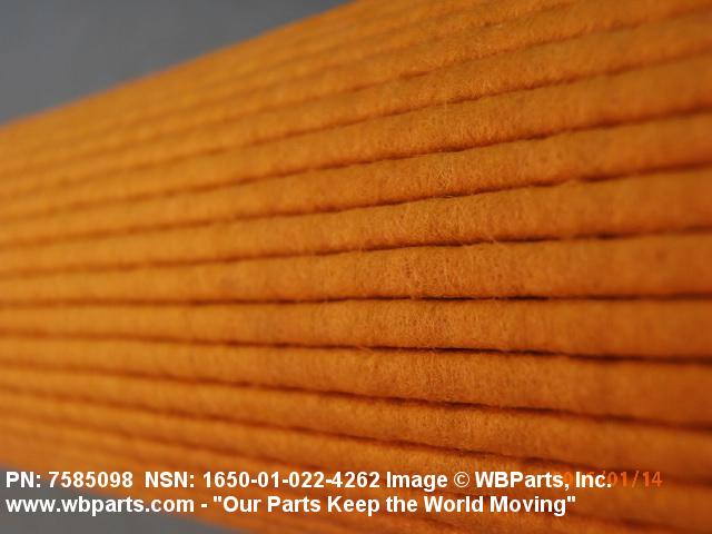 1650-01-022-4262 A replaceable device designed to remove solid particles from fluids ranging in density from heavy liquids to gases. The removal of particles is accomplished by porous material (metallic or non-metallic), stacked disks, wound wire, or the like, constructed so the fluid can flow through the device while the solid particles are retained. It may be designed to fit into a FILTER, FLUID (or similar cavity), or it may have an integral outer casing and mounting facilities and be designed to connect directly to an engine, compressor, or the like. The degree of removal of particles must be nominally rated at less than 50 microns or absolutely rated at less than 75 microns. Excludes FILTER ELEMENT, AIR CONDITIONING. See also STRAINER ELEMENT, SEDIMENT.20916500058Aircraft Hydraulic, Vacuum, and De-icing System Components29100042Engine Fuel System Components, Nonaircraft29150064Engine Fuel System Components, Aircraft and Missile Prime Movers29400064Engine Air and Oil Filters, Strainers, and Cleaners, Nonaircraft29450059Engine Air and Oil Filters, Cleaners, Aircraft Prime Moving43300057Centrifugals, Separators, and Pressure and Vacuum Filters5999000065300053Hospital Furniture, Equipment, Utensils, and Supplies66300029Chemical Analysis Instruments
