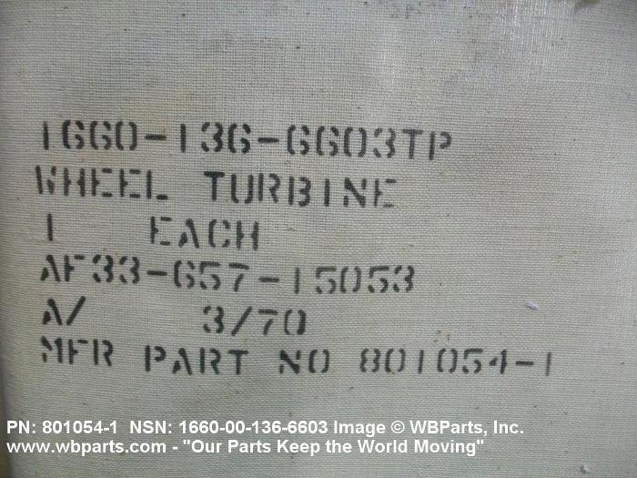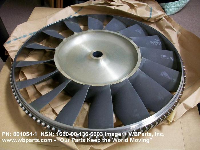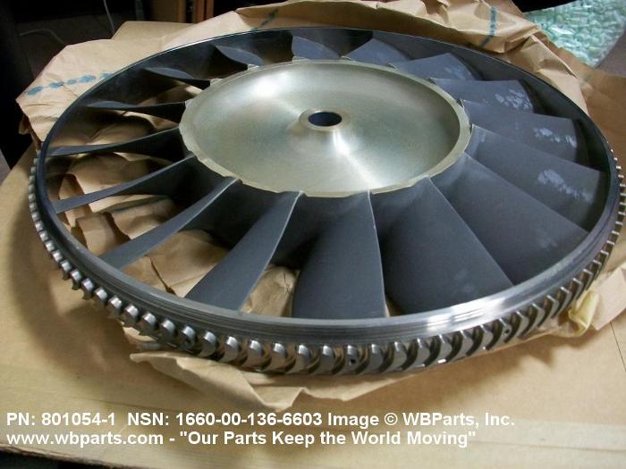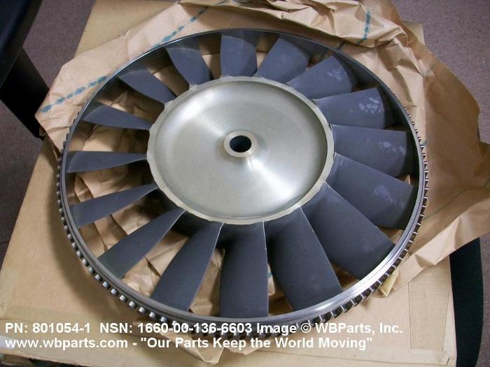1660-00-136-6603 An item consisting of blades or vanes equally spaced around the periphery or face of a hub, rotor or wheel. Designed to receive the energy of compressed air directed through nozzle vanes and impinged upon the blades of the turbine wheel creating rotary energy and motion. Drives an impeller or fan and discharges cool air. Consists of a single one piece wheel. It is a rotating part of an aircraft cooling turbine.