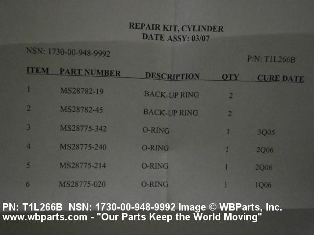 1730-00-948-9992 A collection of various o-rings, seals, sleeves, wear rings and gaskets to repair actuating cylinders. May include cylinder and mounting hardware.20816500058Aircraft Hydraulic, Vacuum, and De-icing System Components25900034Miscellaneous Vehicular Components30400042Miscellaneous Power Transmission Equipment38050037Earth Moving and Excavating Equipment38100024Cranes and Crane-Shovels38300029Truck and Tractor Attachments39300045Warehouse Trucks and Tractors, Self-Propelled39500037Winches, Hoists, Cranes, and Derricks