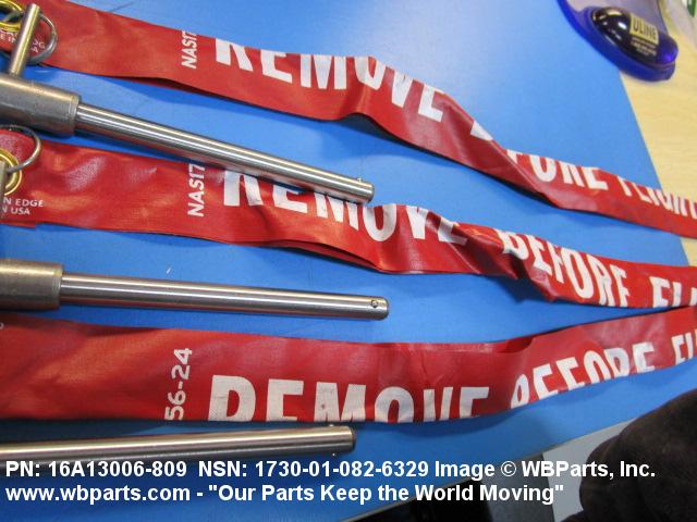 1730-01-082-6329 An item consisting of a pin/pins attached to a STREAMER,WARNING. It may be of various sizes and types and is generally a cylindrically-shaped metallic item having straight irregular contours. The item is installed in specific locations on aircraft, guided missiles, space vehicles, rockets, bombs, and mine dispensers, armament pods, and the like to prevent inadvertent operation and as a warning that certain preoperation functions are required.20317300035Aircraft Ground Servicing Equipment20900039Miscellaneous Ship and Marine Equipment25900034Miscellaneous Vehicular Components