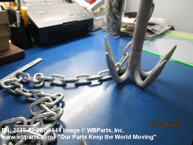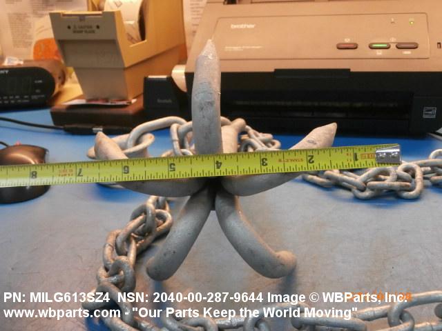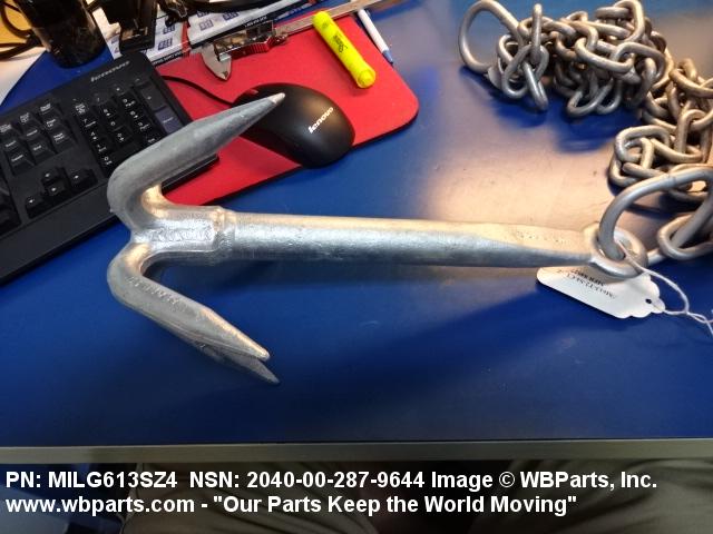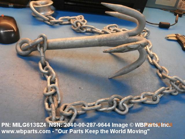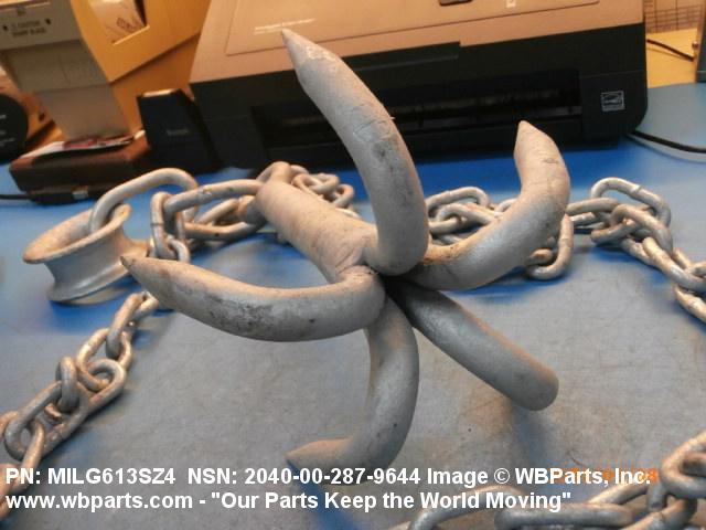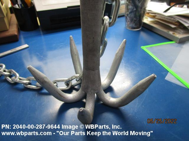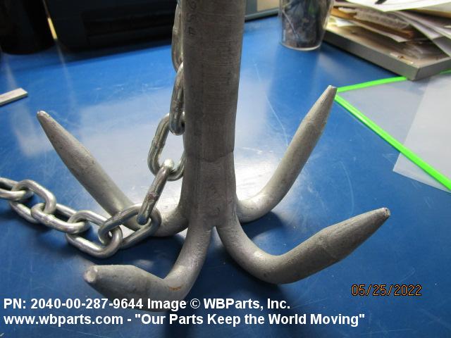2040-00-287-9644 An item consisting of a shank with a number of curved prongs or hooks rigidly attached at one end and an eye on the other end designed for securing small boats and buoys and for recovering small objects from the bottom of the sea.