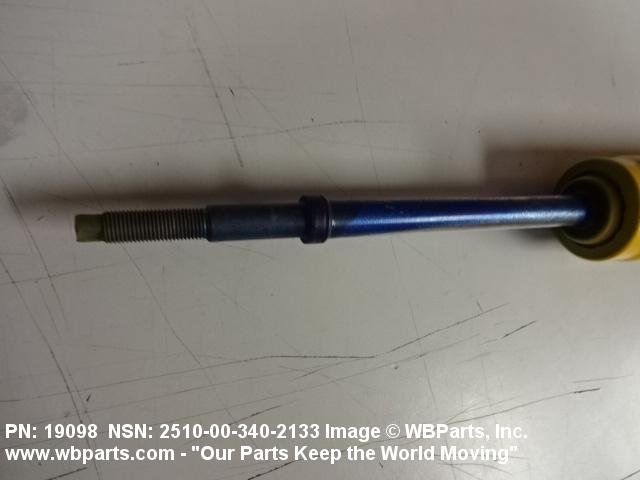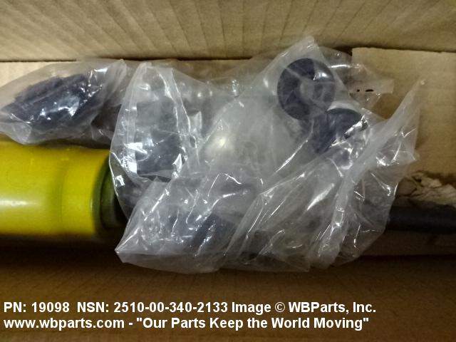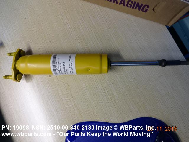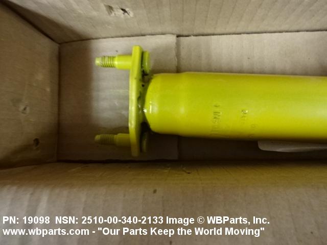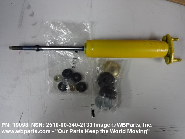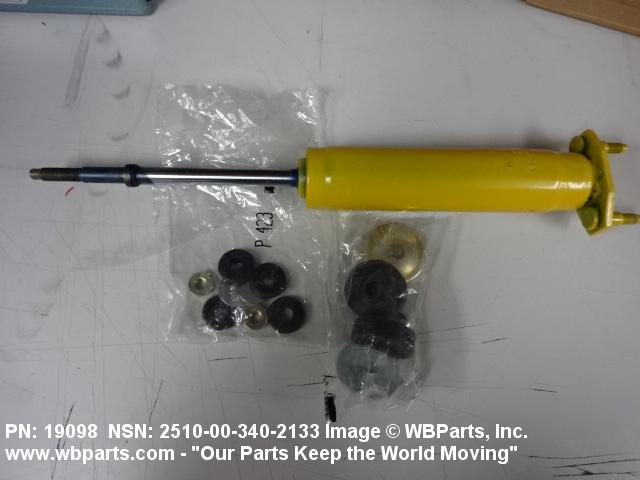 2510-00-340-2133 A damper, either frictional or hydraulic, designed to dampen the shock of suddenly applied force and/or to control spring rebound and oscillation, usually attached to the vehicle frame, body or hull and connected to an axle, spring, spring support web or pad or between suspension arms of track-laying vehicles. See also MOUNT, RESILIENT and SHOCK ABSORBER, LEVER ACTION.