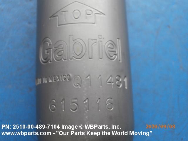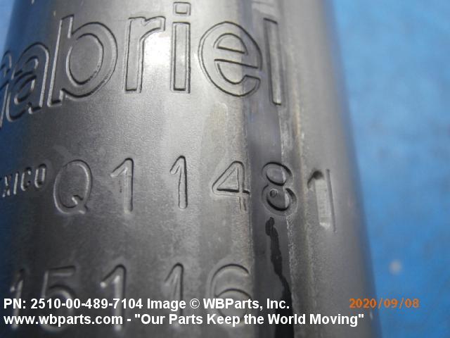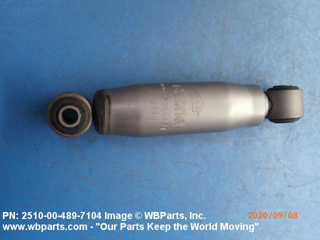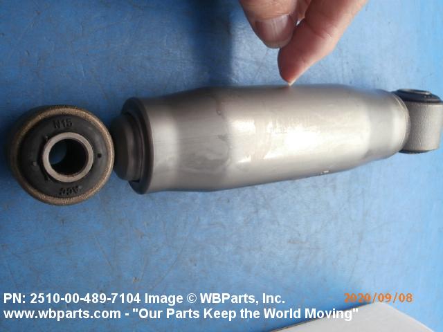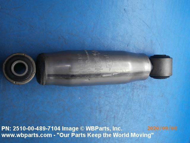 2510-00-489-7104 A damper, either frictional or hydraulic, designed to dampen the shock of suddenly applied force and/or to control spring rebound and oscillation, usually attached to the vehicle frame, body or hull and connected to an axle, spring, spring support web or pad or between suspension arms of track-laying vehicles. See also MOUNT, RESILIENT and SHOCK ABSORBER, LEVER ACTION.