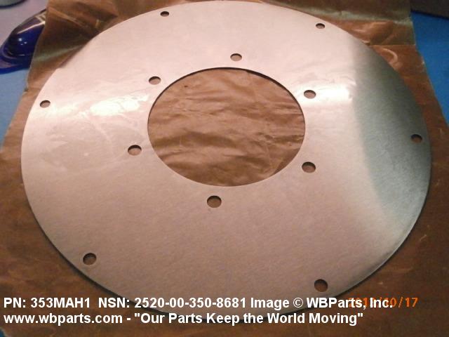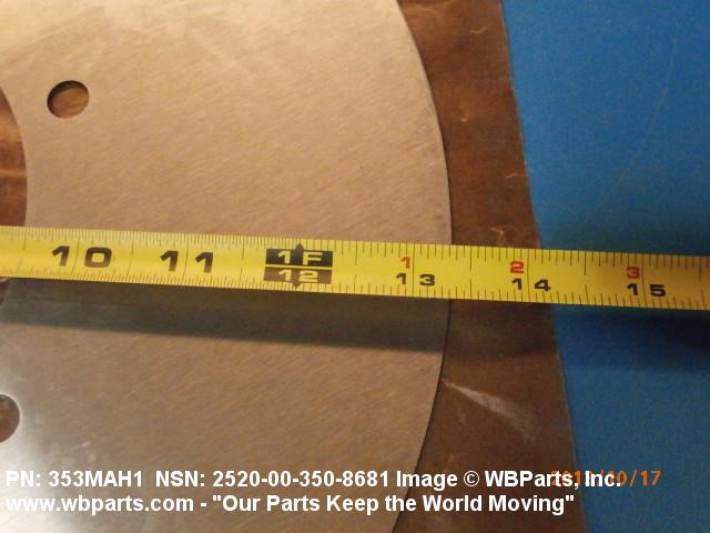 2520-00-350-8681 A solid circular disk of wire-woven lining material or ceramic and metal substance and the like, molded to one or both sides and fastened directly or indirectly to the center spline or hub, which receives and transmits motion or power by engagement with the pressure plate assembly and the flywheel or the like. Includes dry or wet type disk, and may include damper springs. This item is designed to be used on tanks, automobiles, construction equipment, and the like in conjunction with a CLUTCH ASSEMBLY, FRICTION.