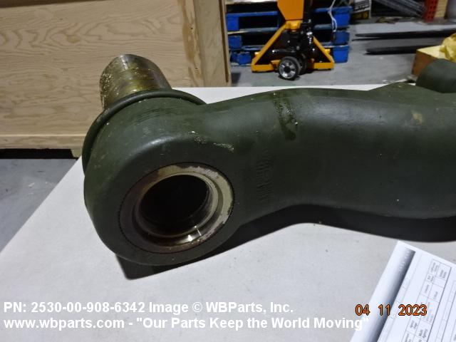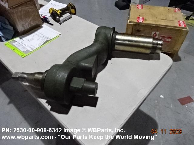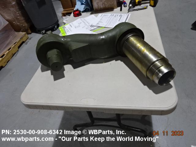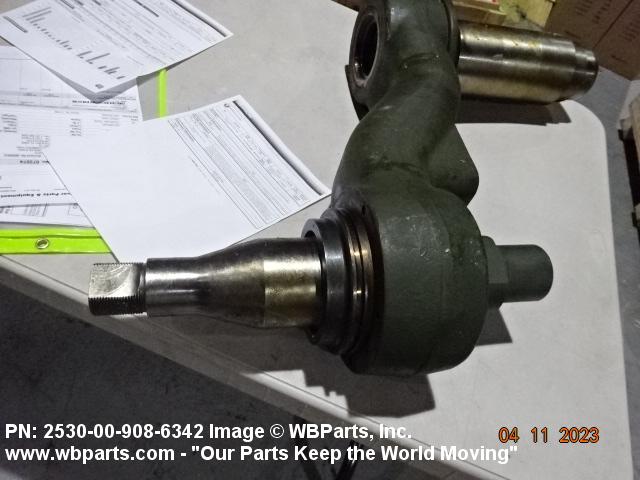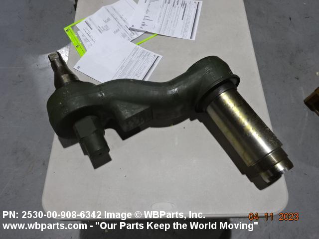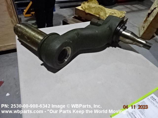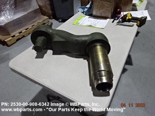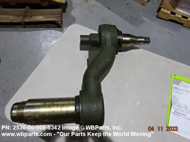2530-00-908-6342 An item of rigid construction, which is a component of the track suspension of track laying vehicles. It is specifically designed to pivot at one end and to accommodate a road wheel or a compensating idler wheel on the other, it may have provision for mounting a TORSION BAR, SUSPENSION or other suspension elements at the pivoting axis. It may include spindle(s), bearing(s), hub(s), and the like, and may have provisions for mounting a shock absorber and/or a track tension adjusting link.
