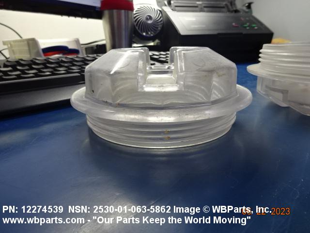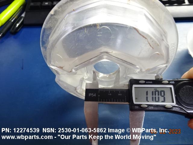 | GENERAL CHARACTERISTICS ITEM DESCRIPTION | MATERIAL:PLASTIC MOLDING,POLYCARBONATE,SPEC L-P-393,ULTRAVIOLET STABILIZED:CLEAR TINT. O/A WALL THICKNESS 0.150 IN,SHAPE:CIRCULAR. SHALL WITHSTAND IMPACT OF 125 FT LB IN AN AXIAL DIRECTION. HUB OPENING DIAMETER: 1.125 INNOM,O/A DIAMETER:5.780 IN NOM. REFER TO DRAWING 12274539 FOR DATA |