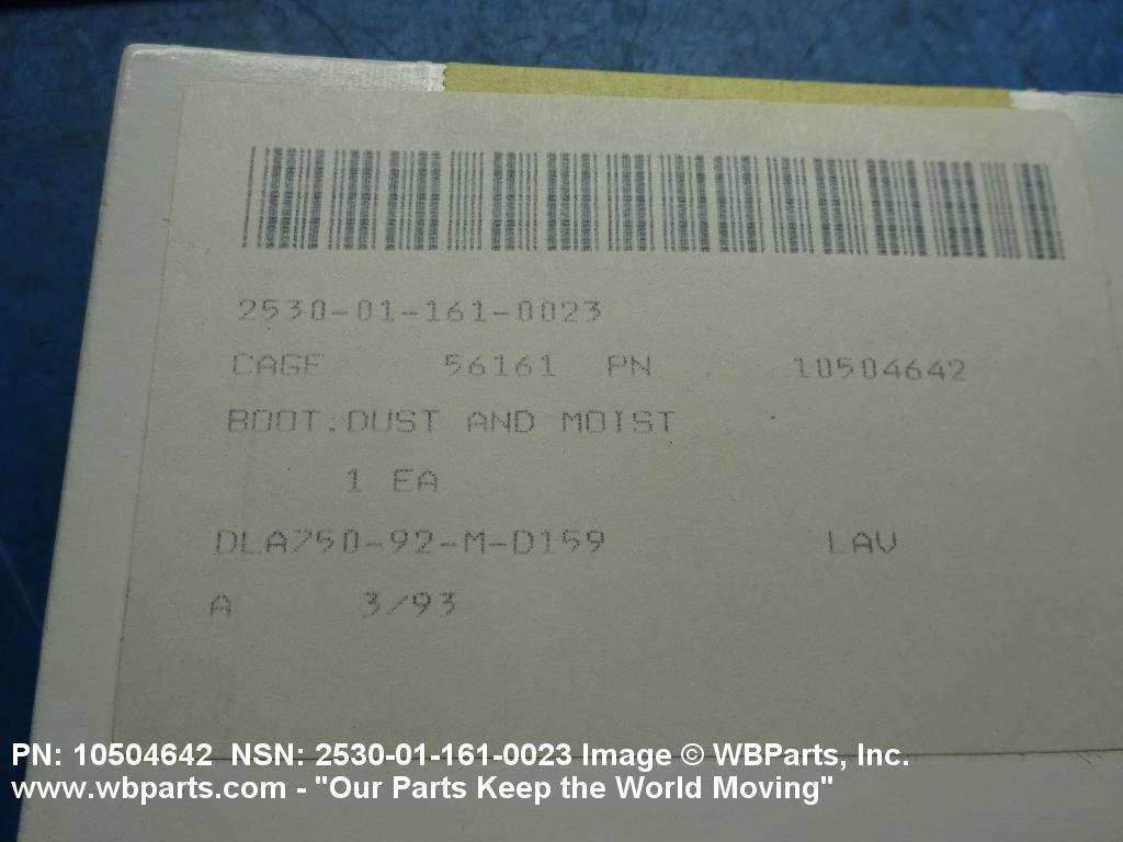 2530-01-161-0023 A flexible, nonmetallic item designed to prevent entry of dust, moisture and other contaminants into critical areas around vehicular steering and brake components and the like. Sealing may be either static or dynamic. The item may include mounting hardware (support plates, clamps and the like). See also BOOT, POWER TRANSMISSION COMPONENTS. Excludes BOOT, DUST AND MOISTURE SEAL.