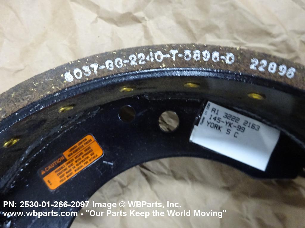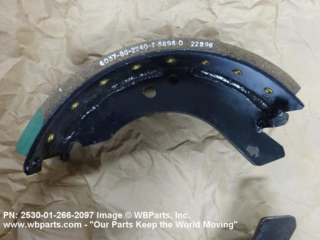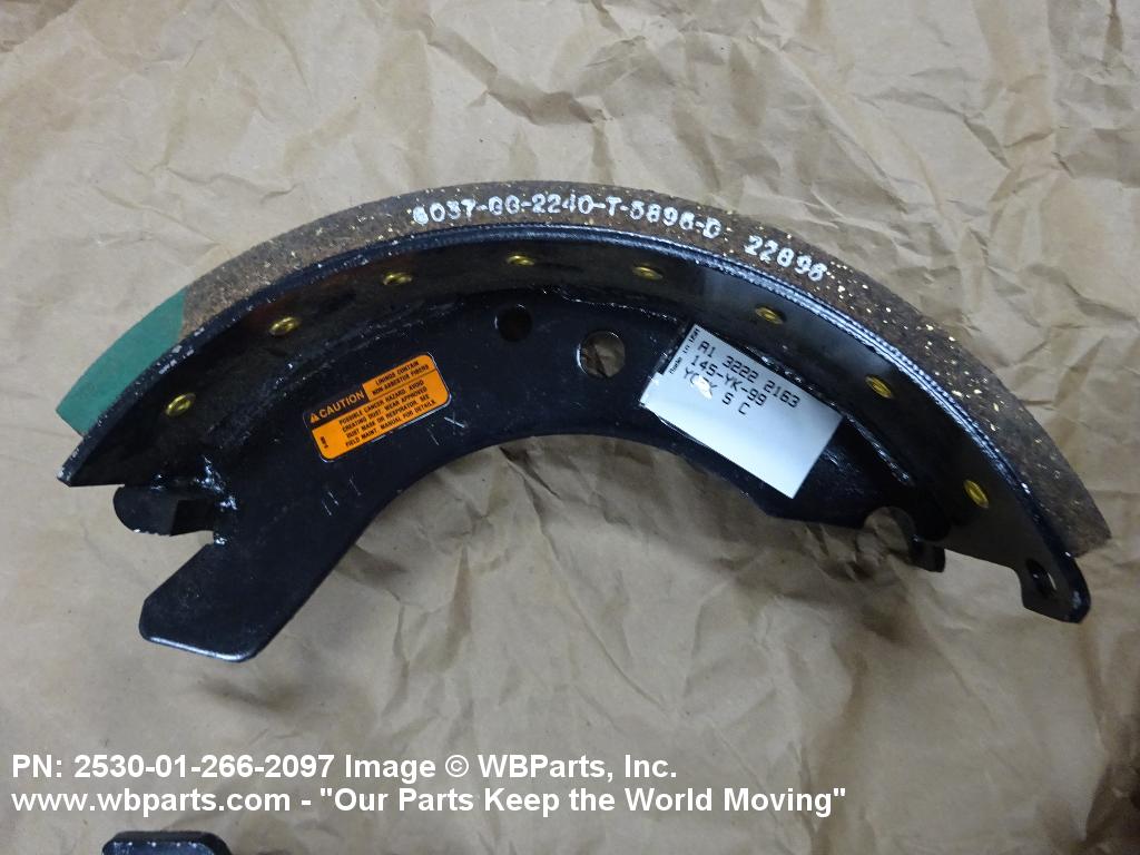 2530-01-266-2097 A group of replacement parts consisting of two or more BRAKE SHOE. It may include retaining springs, washers, shoe guide pins and the like. Excludes items furnished with backing plate, spider and/or hydraulic wheel cylinder(s), shoe segment sets for brake expander tubes, and BRAKE (as modified).20316300032Aircraft Wheel and Brake Systems25300060Vehicular Brake, Steering, Axle, Wheel, and Track Components30400042Miscellaneous Power Transmission Equipment
