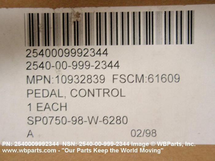2540-00-999-2344 An item designed for attachment to a control lever, rod, shaft or the like to facilitate foot movement of the control device. Excludes pedals with integral or attached shafts or arms; PAD, PEDAL; PEDAL, BICYCLE; PEDAL, BASS DRUM; and PEDAL, SOCK, HIGH HAT CYMBAL.20316800049Miscellaneous Aircraft Accessories and Components25400035Vehicular Furniture and Accessories30400042Miscellaneous Power Transmission Equipment