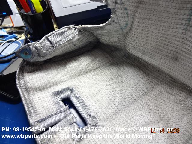 | SPECIAL FEATURES | MUFFLER BLANKET SHALL BE RESISTANT TO OIL AND WATER,TEMPERATURE RANGE -60 DEG F TO 1100 DEG F WITH MUFFLER SURFACE BEING 1100 DEG F,EXTERIOROF BLANKET SHALL NOT EXCEED 200 DEG F,LACING WIRE .032 DIA 302 STAINLESS STEEL,GLASS INSULATING MATERIAL 1/2 INCH THK CHOPPED GLASS FIBER,OUTTER COVER SILICONE IMPREGNATED FIBERGLASS FABRIC,MUFFLER BLANKER MUST FIT 98-19607(MUFFLER BODY AND PIPES) |