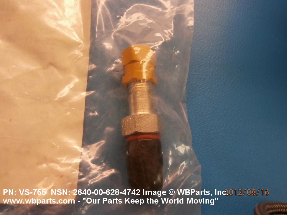 2640-00-628-4742 A metal, or metal and rubber, tubular stem containing a valve core and cap. The mounting end may have a base with a fitting designed for mounting on a pneumatic tire, inner tube, or tire rim, to permit and retain inflation or permit deflation. The mounting end may be internally threaded for adaptability to a valve spud or may be provided with cure-on or clamp in features. The other end is externally threaded to accommodate a valve cap, and internally threaded to accommodate the valve core.