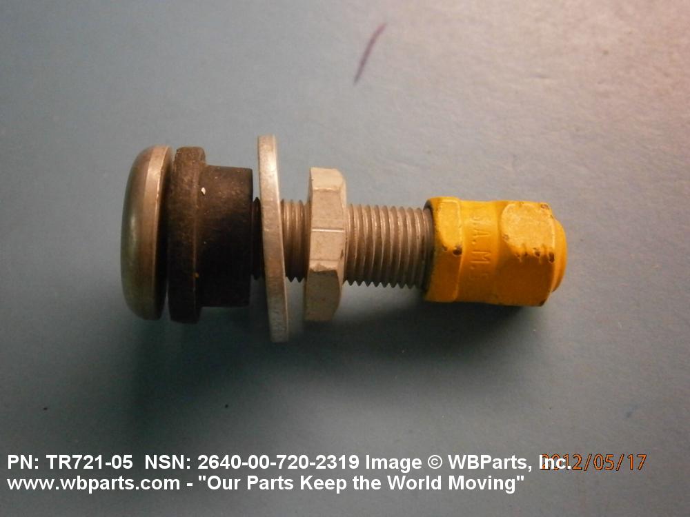 2640-00-720-2319 A metal, or metal and rubber, tubular stem containing a valve core and cap. The mounting end may have a base with a fitting designed for mounting on a pneumatic tire, inner tube, or tire rim, to permit and retain inflation or permit deflation. The mounting end may be internally threaded for adaptability to a valve spud or may be provided with cure-on or clamp in features. The other end is externally threaded to accommodate a valve cap, and internally threaded to accommodate the valve core.