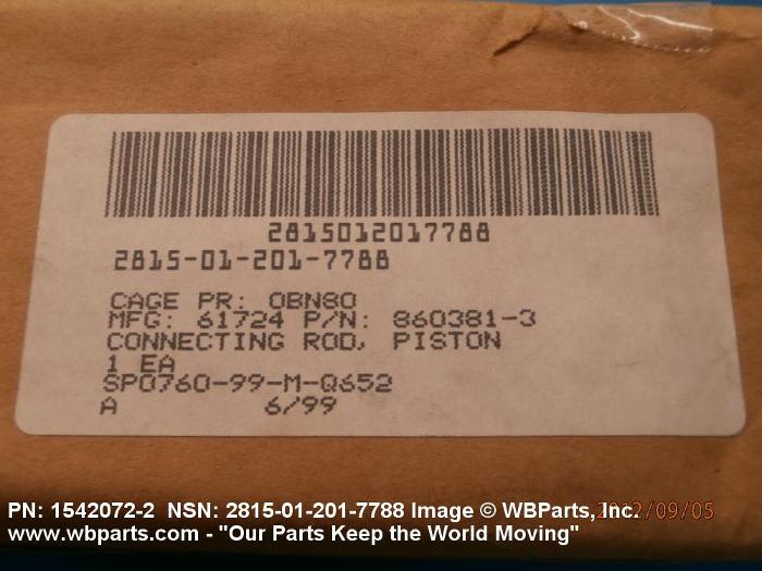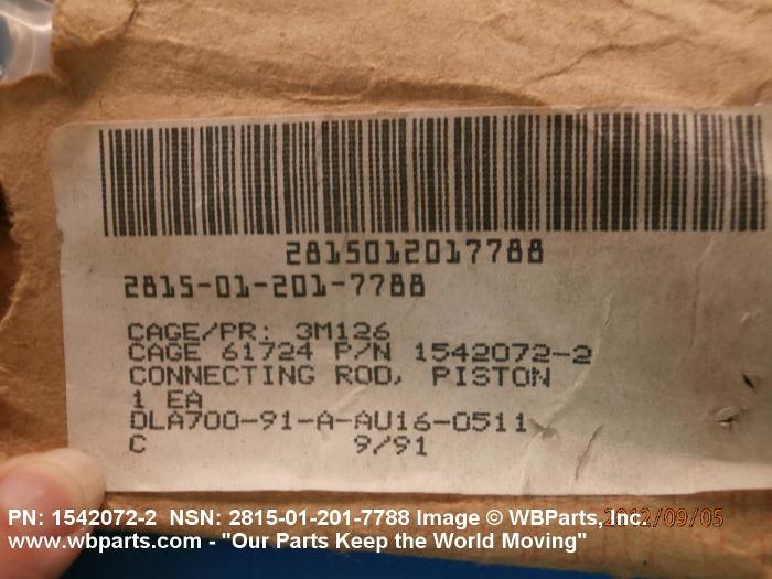 2815-01-201-7788 A device used for connecting a piston to a crankshaft or to a master connecting rod of an internal combustion engine, steam reciprocating engine, reciprocating air compressor, or the like. The rod may be connected directly to the piston, or it may transmit the motion through a crosshead.20725300060Vehicular Brake, Steering, Axle, Wheel, and Track Components28050063Gasoline Reciprocating Engines, Except Aircraft; and Components28100068Gasoline Reciprocating Engines, Aircraft Prime Mover; and Components28150029Diesel Engines and Components41300045Refrigeration and Air Conditioning Components43100028Compressors and Vacuum Pumps43200020Power and Hand Pumps