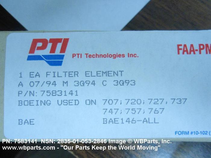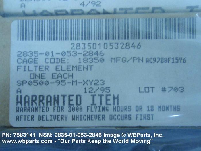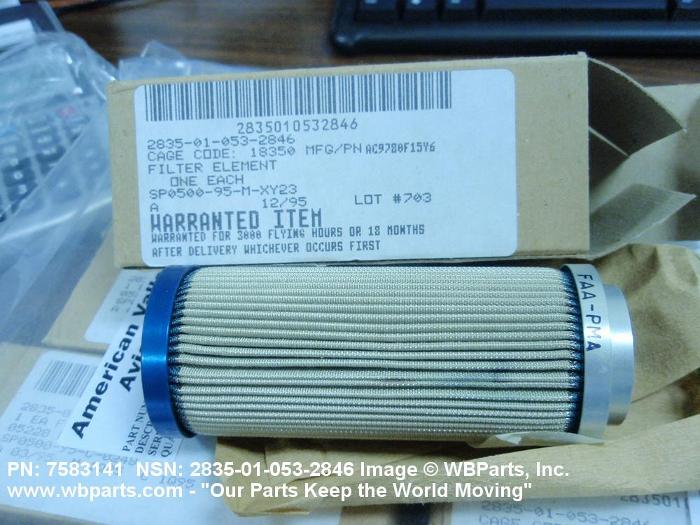 2835-01-053-2846 A replaceable device designed to remove solid particles from fluids ranging in density from heavy liquids to gases. The removal of particles is accomplished by porous material (metallic or non-metallic), stacked disks, wound wire, or the like, constructed so the fluid can flow through the device while the solid particles are retained. It may be designed to fit into a FILTER, FLUID (or similar cavity), or it may have an integral outer casing and mounting facilities and be designed to connect directly to an engine, compressor, or the like. The degree of removal of particles must be nominally rated at less than 50 microns or absolutely rated at less than 75 microns. Excludes FILTER ELEMENT, AIR CONDITIONING. See also STRAINER ELEMENT, SEDIMENT.20916500058Aircraft Hydraulic, Vacuum, and De-icing System Components29100042Engine Fuel System Components, Nonaircraft29150064Engine Fuel System Components, Aircraft and Missile Prime Movers29400064Engine Air and Oil Filters, Strainers, and Cleaners, Nonaircraft29450059Engine Air and Oil Filters, Cleaners, Aircraft Prime Moving43300057Centrifugals, Separators, and Pressure and Vacuum Filters5999000065300053Hospital Furniture, Equipment, Utensils, and Supplies66300029Chemical Analysis Instruments