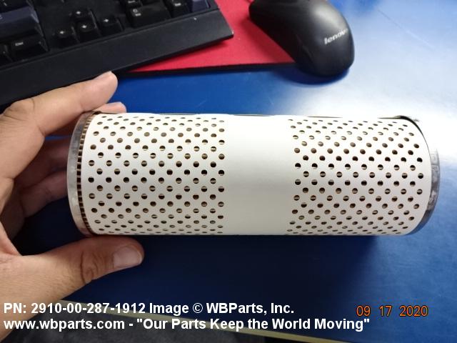 2910-00-287-1912 A replaceable device designed to remove solid particles from fluids ranging in density from heavy liquids to gases. The removal of particles is accomplished by porous material (metallic or non-metallic), stacked disks, wound wire, or the like, constructed so the fluid can flow through the device while the solid particles are retained. It may be designed to fit into a FILTER, FLUID (or similar cavity), or it may have an integral outer casing and mounting facilities and be designed to connect directly to an engine, compressor, or the like. The degree of removal of particles must be nominally rated at less than 50 microns or absolutely rated at less than 75 microns. Excludes FILTER ELEMENT, AIR CONDITIONING. See also STRAINER ELEMENT, SEDIMENT.20916500058Aircraft Hydraulic, Vacuum, and De-icing System Components29100042Engine Fuel System Components, Nonaircraft29150064Engine Fuel System Components, Aircraft and Missile Prime Movers29400064Engine Air and Oil Filters, Strainers, and Cleaners, Nonaircraft29450059Engine Air and Oil Filters, Cleaners, Aircraft Prime Moving43300057Centrifugals, Separators, and Pressure and Vacuum Filters5999000065300053Hospital Furniture, Equipment, Utensils, and Supplies66300029Chemical Analysis Instruments
