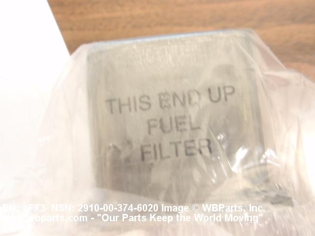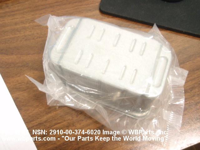 2910-00-374-6020 A replaceable device designed to remove solid particles from fluids ranging in density from heavy liquids to gases. The removal of particles is accomplished by porous material (metallic or non-metallic), stacked disks, wound wire, or the like, constructed so the fluid can flow through the device while the solid particles are retained. It may be designed to fit into a FILTER, FLUID (or similar cavity), or it may have an integral outer casing and mounting facilities and be designed to connect directly to an engine, compressor, or the like. The degree of removal of particles must be nominally rated at less than 50 microns or absolutely rated at less than 75 microns. Excludes FILTER ELEMENT, AIR CONDITIONING. See also STRAINER ELEMENT, SEDIMENT.20916500058Aircraft Hydraulic, Vacuum, and De-icing System Components29100042Engine Fuel System Components, Nonaircraft29150064Engine Fuel System Components, Aircraft and Missile Prime Movers29400064Engine Air and Oil Filters, Strainers, and Cleaners, Nonaircraft29450059Engine Air and Oil Filters, Cleaners, Aircraft Prime Moving43300057Centrifugals, Separators, and Pressure and Vacuum Filters5999000065300053Hospital Furniture, Equipment, Utensils, and Supplies66300029Chemical Analysis Instruments