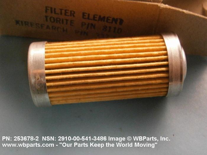 2910-00-541-3486 A replaceable device designed to remove solid particles from fluids ranging in density from heavy liquids to gases. The removal of particles is accomplished by porous material (metallic or non-metallic), stacked disks, wound wire, or the like, constructed so the fluid can flow through the device while the solid particles are retained. It may be designed to fit into a FILTER, FLUID (or similar cavity), or it may have an integral outer casing and mounting facilities and be designed to connect directly to an engine, compressor, or the like. The degree of removal of particles must be nominally rated at less than 50 microns or absolutely rated at less than 75 microns. Excludes FILTER ELEMENT, AIR CONDITIONING. See also STRAINER ELEMENT, SEDIMENT.20916500058Aircraft Hydraulic, Vacuum, and De-icing System Components29100042Engine Fuel System Components, Nonaircraft29150064Engine Fuel System Components, Aircraft and Missile Prime Movers29400064Engine Air and Oil Filters, Strainers, and Cleaners, Nonaircraft29450059Engine Air and Oil Filters, Cleaners, Aircraft Prime Moving43300057Centrifugals, Separators, and Pressure and Vacuum Filters5999000065300053Hospital Furniture, Equipment, Utensils, and Supplies66300029Chemical Analysis Instruments