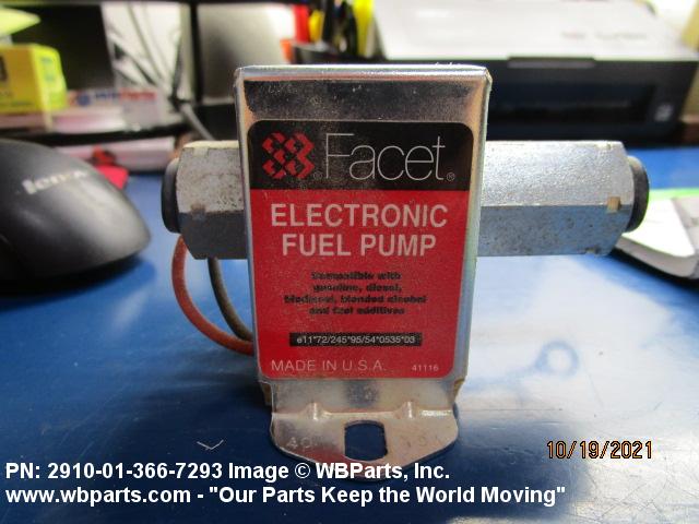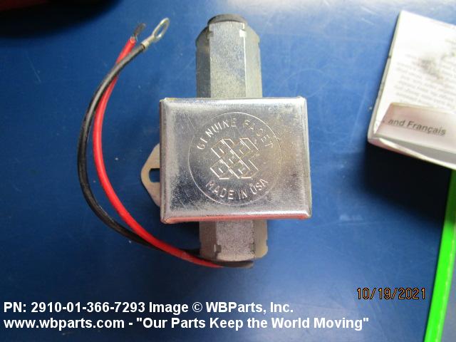 2910-01-366-7293 An electrically actuated positive displacement device, which utilizes reciprocating or rotary motion to transfer fuel from a tank to a carburetor or fuel injector metering and distribution pump of an internal combustion engine. Excludes General Purpose Pumps.