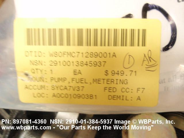 2910-01-384-5937 A device specifically designed to (1) increase the pressure of, (2) meter the amount of, (3) control the distribution of liquid fuel received directly or indirectly from the TANK, FUEL, ENGINE to the individual air inlet tubes or combustion chambers of gasoline or diesel engines.20229100042Engine Fuel System Components, Nonaircraft29150064Engine Fuel System Components, Aircraft and Missile Prime Movers