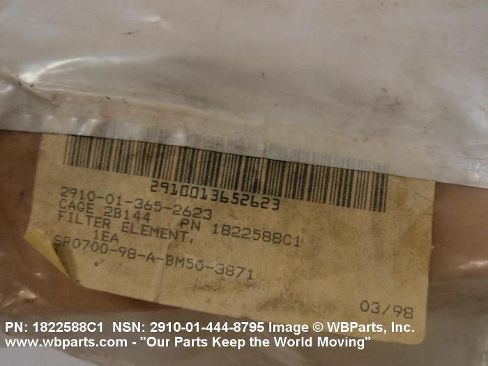 2910-01-444-8795 A replaceable device designed to remove solid particles from fluids ranging in density from heavy liquids to gases. The removal of particles is accomplished by porous material (metallic or non-metallic), stacked disks, wound wire, or the like, constructed so the fluid can flow through the device while the solid particles are retained. It may be designed to fit into a FILTER, FLUID (or similar cavity), or it may have an integral outer casing and mounting facilities and be designed to connect directly to an engine, compressor, or the like. The degree of removal of particles must be nominally rated at less than 50 microns or absolutely rated at less than 75 microns. Excludes FILTER ELEMENT, AIR CONDITIONING. See also STRAINER ELEMENT, SEDIMENT.20916500058Aircraft Hydraulic, Vacuum, and De-icing System Components29100042Engine Fuel System Components, Nonaircraft29150064Engine Fuel System Components, Aircraft and Missile Prime Movers29400064Engine Air and Oil Filters, Strainers, and Cleaners, Nonaircraft29450059Engine Air and Oil Filters, Cleaners, Aircraft Prime Moving43300057Centrifugals, Separators, and Pressure and Vacuum Filters5999000065300053Hospital Furniture, Equipment, Utensils, and Supplies66300029Chemical Analysis Instruments