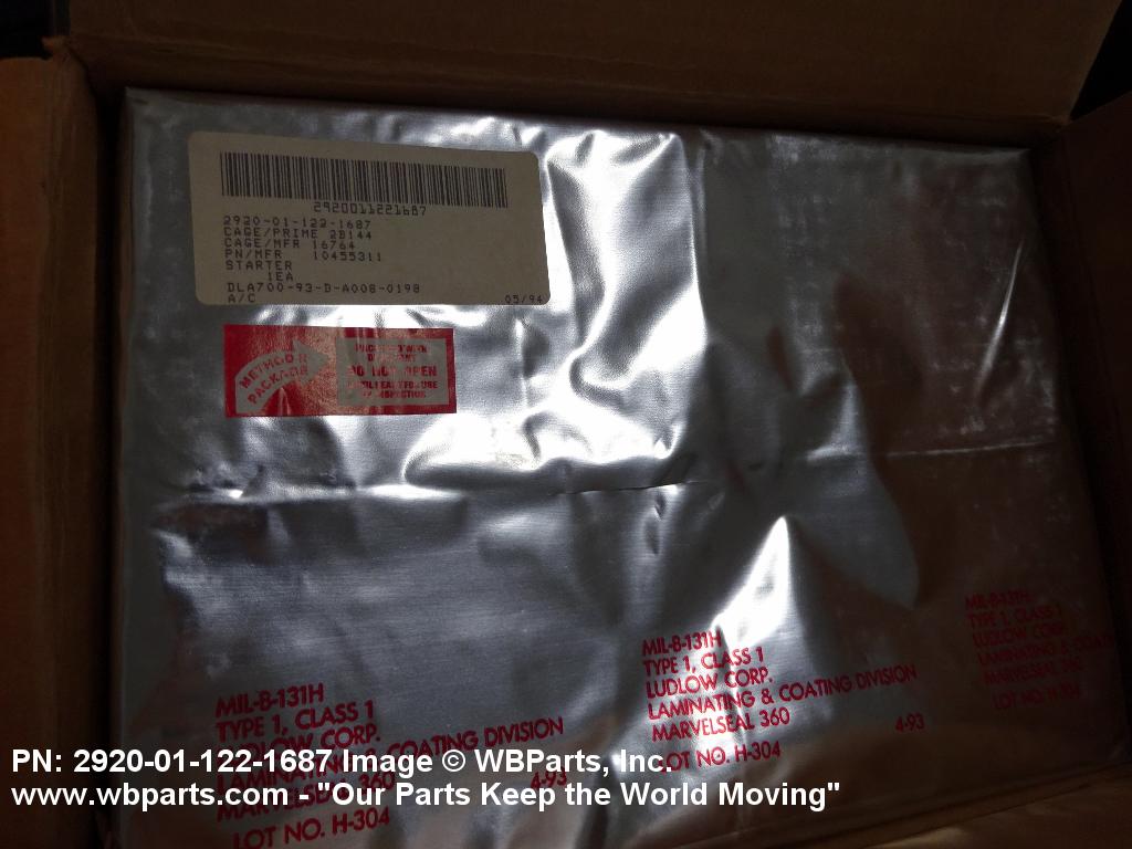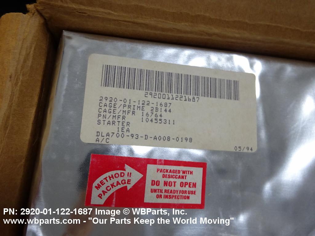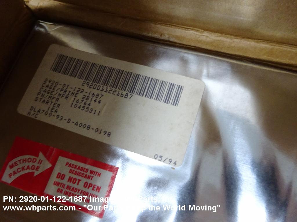 2920-01-122-1687 An item consisting of an electric, direct current, motor and integral and associated components, primarily designed to crank an internal combustion engine, or a gas turbine engine until it starts operating under its own power. May include facilities for manual or mechanical actuation. Excludes MOTOR, ENGINE STARTER, ELECTRICAL; STARTER, MOTOR; STARTER, ENGINE (as modified); and SWITCH, ENGINE STARTER, ELECTRICAL.2031730000029200048Engine Electrical System Components, Nonaircraft29250058Engine Electrical System Components, Aircraft Prime Moving
