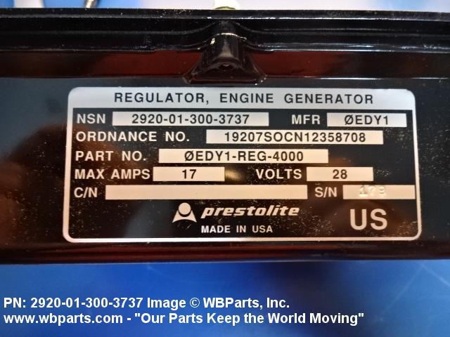 2920-01-300-3737 A regulator designed to automatically maintain the current and/or voltage output of an engine generator within specified limits, regardless of variation of load or input voltages. May include cutout relay. Does not include items in which regulation is accomplished by transformer action. See also REGULATOR, CURRENT and REGULATOR, VOLTAGE.20229200048Engine Electrical System Components, Nonaircraft29250058Engine Electrical System Components, Aircraft Prime Moving