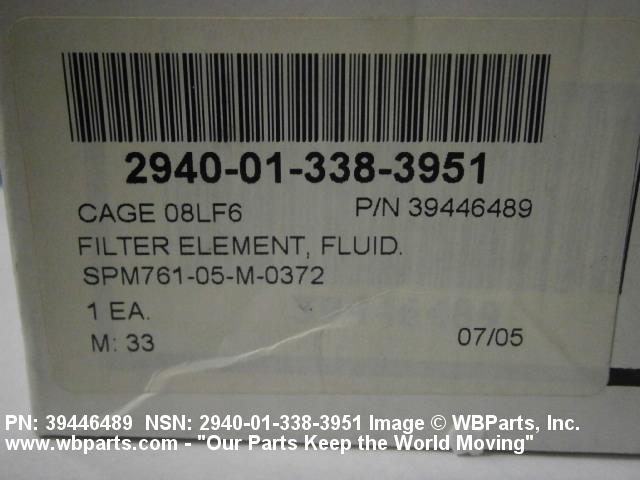 2940-01-338-3951 A replaceable device designed to remove solid particles from fluids ranging in density from heavy liquids to gases. The removal of particles is accomplished by porous material (metallic or non-metallic), stacked disks, wound wire, or the like, constructed so the fluid can flow through the device while the solid particles are retained. It may be designed to fit into a FILTER, FLUID (or similar cavity), or it may have an integral outer casing and mounting facilities and be designed to connect directly to an engine, compressor, or the like. The degree of removal of particles must be nominally rated at less than 50 microns or absolutely rated at less than 75 microns. Excludes FILTER ELEMENT, AIR CONDITIONING. See also STRAINER ELEMENT, SEDIMENT.20916500058Aircraft Hydraulic, Vacuum, and De-icing System Components29100042Engine Fuel System Components, Nonaircraft29150064Engine Fuel System Components, Aircraft and Missile Prime Movers29400064Engine Air and Oil Filters, Strainers, and Cleaners, Nonaircraft29450059Engine Air and Oil Filters, Cleaners, Aircraft Prime Moving43300057Centrifugals, Separators, and Pressure and Vacuum Filters5999000065300053Hospital Furniture, Equipment, Utensils, and Supplies66300029Chemical Analysis Instruments