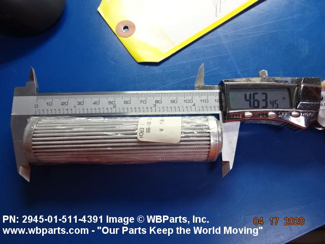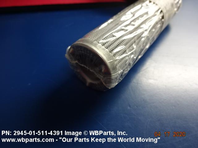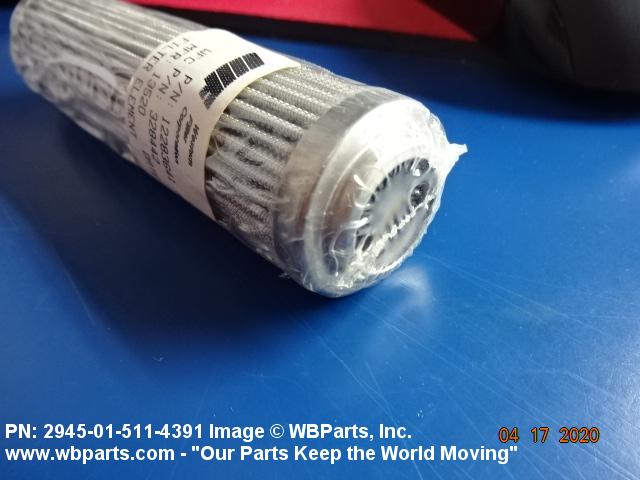 2945-01-511-4391 A replaceable device designed to remove solid particles from fluids ranging in density from heavy liquids to gases. The removal of particles is accomplished by porous material (metallic or non-metallic), stacked disks, wound wire, or the like, constructed so the fluid can flow through the device while the solid particles are retained. It may be designed to fit into a FILTER, FLUID (or similar cavity), or it may have an integral outer casing and mounting facilities and be designed to connect directly to an engine, compressor, or the like. The degree of removal of particles must be nominally rated at less than 50 microns or absolutely rated at less than 75 microns. Excludes FILTER ELEMENT, AIR CONDITIONING. See also STRAINER ELEMENT, SEDIMENT.20916500058Aircraft Hydraulic, Vacuum, and De-icing System Components29100042Engine Fuel System Components, Nonaircraft29150064Engine Fuel System Components, Aircraft and Missile Prime Movers29400064Engine Air and Oil Filters, Strainers, and Cleaners, Nonaircraft29450059Engine Air and Oil Filters, Cleaners, Aircraft Prime Moving43300057Centrifugals, Separators, and Pressure and Vacuum Filters5999000065300053Hospital Furniture, Equipment, Utensils, and Supplies66300029Chemical Analysis Instruments