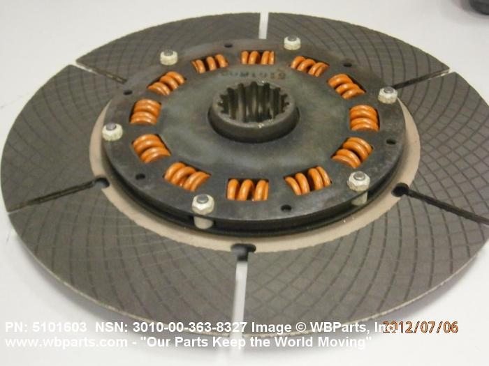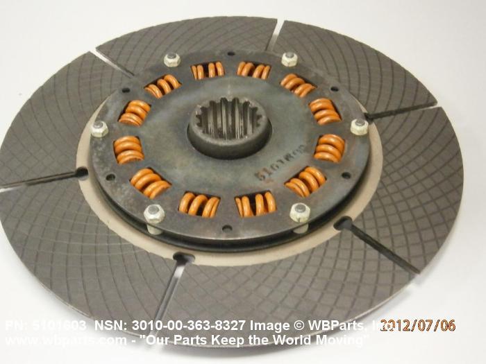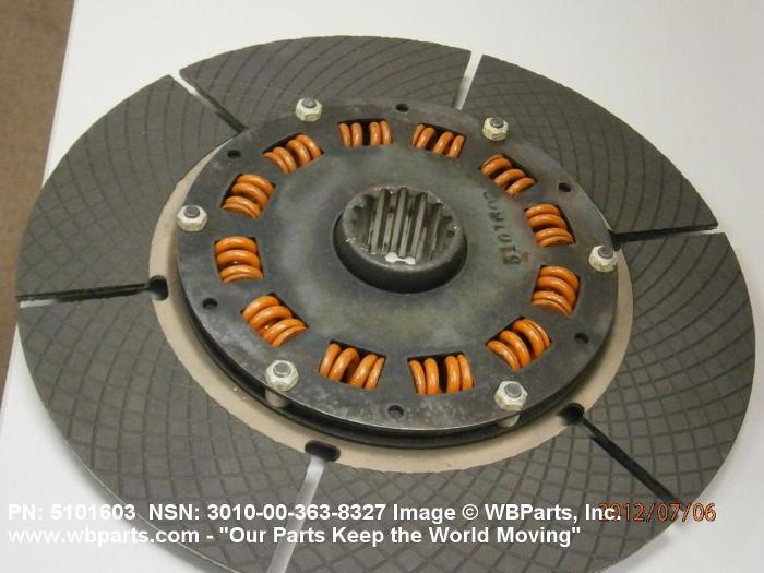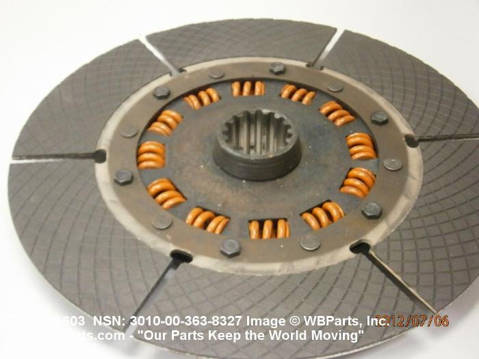 3010-00-363-8327 A solid circular disk of wire-woven lining material or ceramic and metal substance and the like, molded to one or both sides and fastened directly or indirectly to the center spline or hub, which receives and transmits motion or power by engagement with the pressure plate assembly and the flywheel or the like. Includes dry or wet type disk, and may include damper springs. This item is designed to be used on marine, aircraft, and plant equipment in conjunction with a CLUTCH ASSEMBLY, FRICTION.