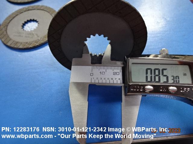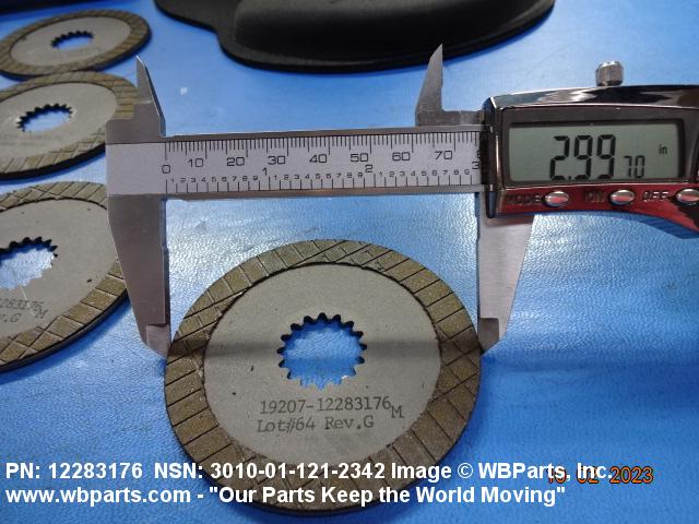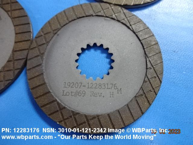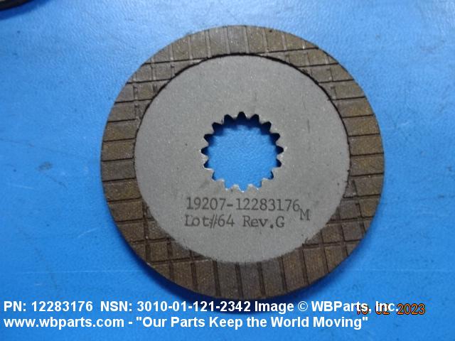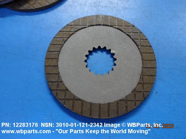 3010-01-121-2342 A solid circular disk of wire-woven lining material or ceramic and metal substance and the like, molded to one or both sides and fastened directly or indirectly to the center spline or hub, which receives and transmits motion or power by engagement with the pressure plate assembly and the flywheel or the like. Includes dry or wet type disk, and may include damper springs. This item is designed to be used on marine, aircraft, and plant equipment in conjunction with a CLUTCH ASSEMBLY, FRICTION.
