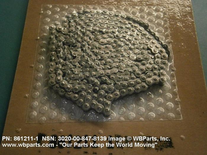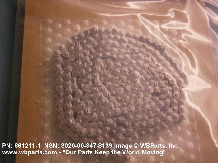 3020-00-847-8139 A flexible mechanical device consisting of one or more rows of links used for conveying or power transmission. The link side plates are flat or offset and are spaced apart by rollers, bushings and/or pins. The chain mates with a sprocket with an articulating action. The non-rotating bushing type chain is limited to that designated by the American National Standards Institute as "roller chain". Excludes CHAIN, BLOCK.