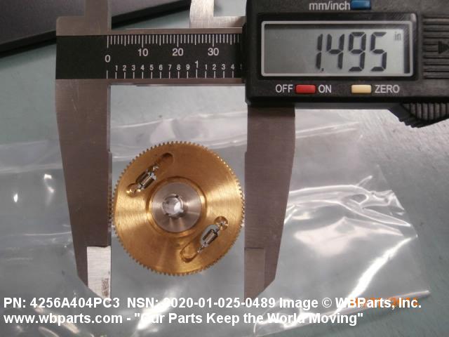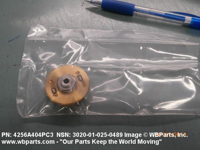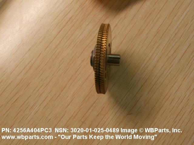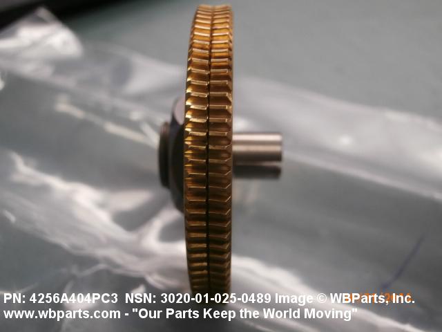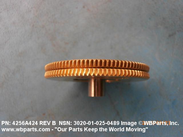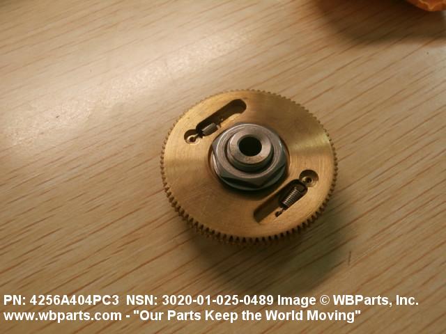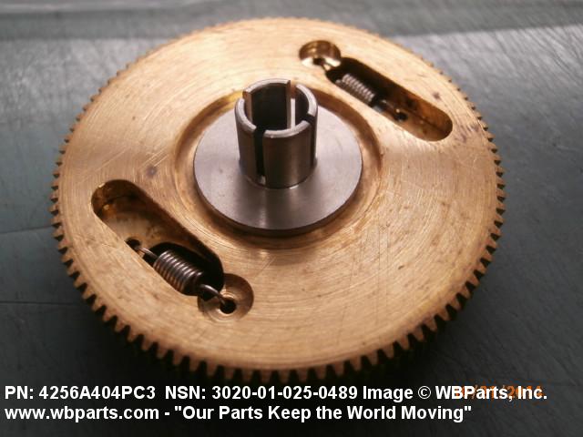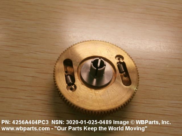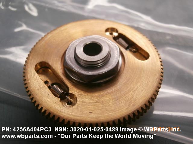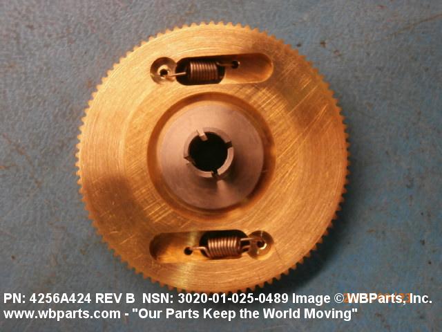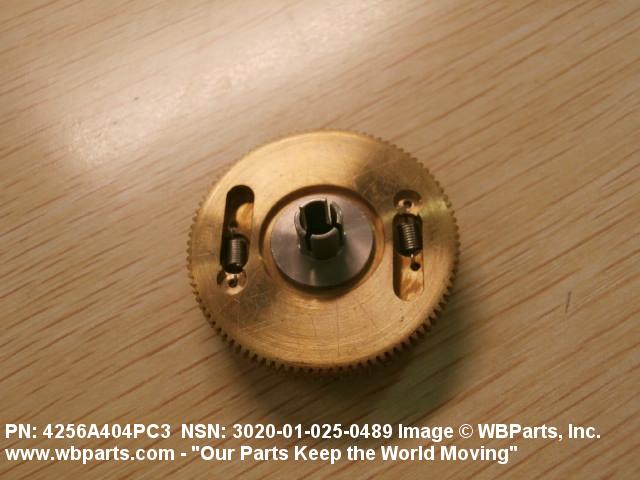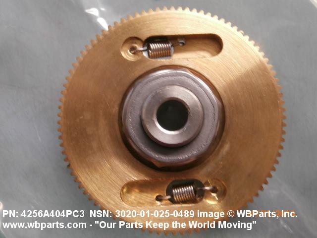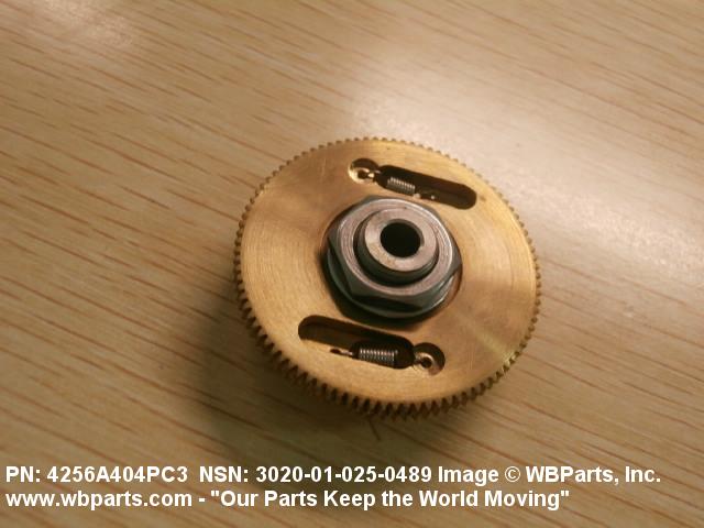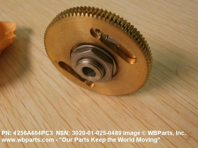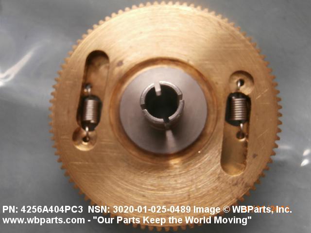3020-01-025-0489 An item having one fixed gear and one free gear, both having the same complement of worm wheel gear teeth, mounted on a common hub. The free gear is attached to the fixed gear by springs and operates as one gear. Upon installation with the mating gear, the teeth of the free moving gear are preset to mesh with teeth other than those of the fixed gear. This spring tension between the fixed gear and the free gear eliminates any free motion between the driver and the driven gear. The gear is used where identical and accurate transmitted motion between gears is required.