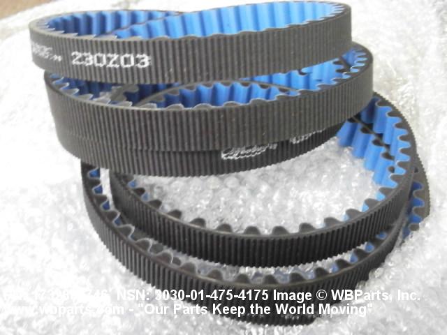 3030-01-475-4175 A flat internally toothed belt or a round belt with protuding pins, designed to engage with corresponding teeth or corresponding grooves on the sprockets over which they run.