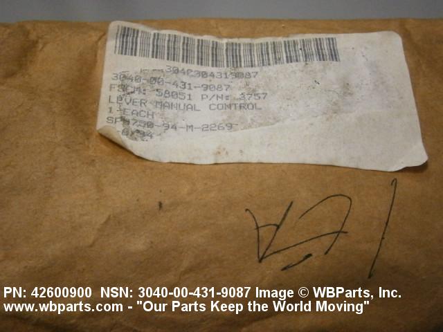 3040-00-431-9087 A rigid item of various shapes and cross-sections, specifically designed to manually actuate and/or regulate a variety of mechanisms. It usually has an integral handgrip, knob, or the like, or provisions for the mounting of the same. It may have accommodations for locking and/or positioning. The point of fulcrum may be an integral shaft perpendicular to the axis or a through hole to provide a definite means of securing, and usually has additional accommodation(s) for attachment of CONNECTING LINK, RIGID; WIRE ROPE ASSEMBLY, SINGLE LEG; and CLEVIS, ROD END; etc.. Excludes ARM (as modified); LEVER, REMOTE CONTROL; and BELL CRANK.20511150037Nuclear Warheads and Warhead Sections11250026Nuclear Demolition Charges11900057Specialized Test and Handling Equipment, Nuclear Ordnance30400042Miscellaneous Power Transmission Equipment53400020Hardware, Commercial
