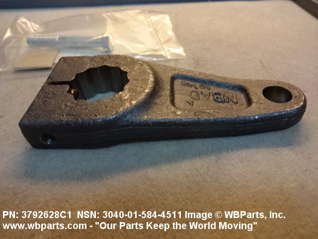 3040-01-584-4511 A rigid item usually in the form of an arm of various shapes and cross sections, containing two or more holes so spaced that one serves as a pivot with or without hubs and must have a definite means for securing to a shaft (such as threaded hole for set-screw, keyway(s), splines, serrations or some clamping device). The other hole(s) connect(s) to CONNECTING LINK, RIGID; WIRE ROPE ASSEMBLY, SINGLE LEG; or CLEVIS, ROD END; to provide transmission of movement to other parts of the mechanism. See also BELL CRANK. For manually operated items see LEVER, MANUAL CONTROL.20311900057Specialized Test and Handling Equipment, Nuclear Ordnance16800049Miscellaneous Aircraft Accessories and Components30400042Miscellaneous Power Transmission Equipment