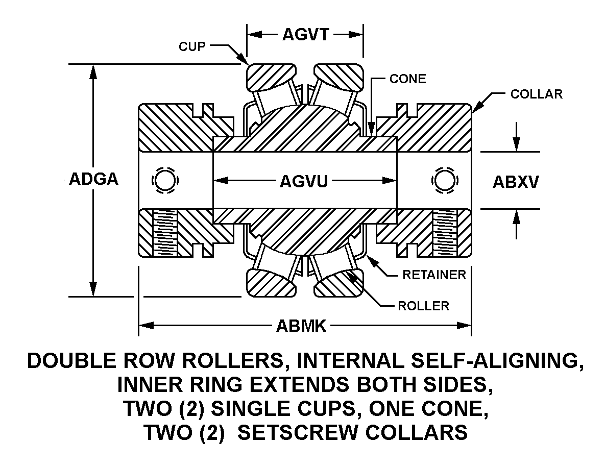 | STYLE DESIGNATOR | 294 DOUBLE ROW ROLLERS, INTERNAL SELF-ALIGNING, INNER RING EXTENDS BOTH SIDES, TWO (2) SINGLE CUPS, ONE CONE, TWO (2) SETSCREW COLLARS |