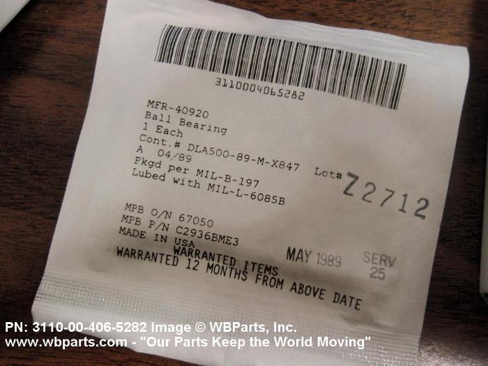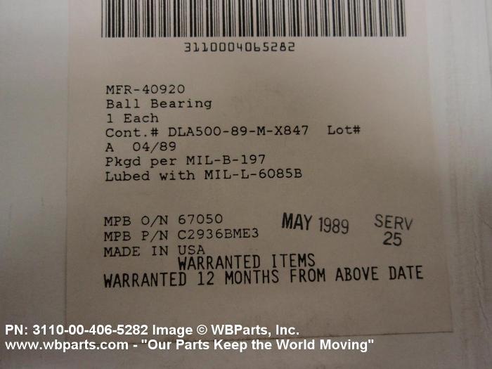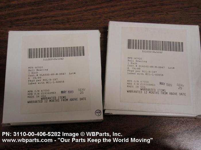 3110-00-406-5282 A cylindrical item in which the inner or outer ring turns upon row(s) of hardened BALL, BEARING which roll on a raceway, thus minimizing friction. These items are characterized by their noncorrosive qualities, lightness of weight, inch dimensions rather than metric, inner rings generally projecting beyond the faces of the outer ring, or a very narrow width inner ring having an outside diameter slightly larger than the bore diameter. Designed primarily for use in aircraft assemblies, such as control systems and surfaces of aircraft. Excludes BEARING, BALL, ANNULAR.