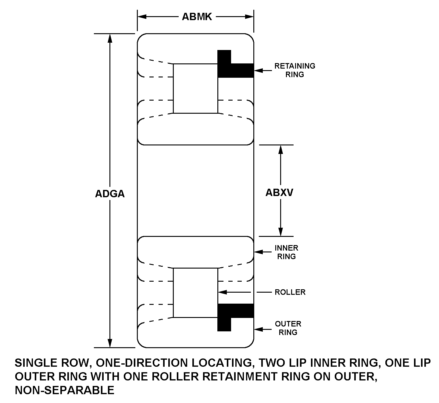 | STYLE DESIGNATOR | 254A SINGLE ROW, ONE-DIRECTION LOCATING, TWO LIP INNER RING, ONE LIP OUTER RING WITH ONE ROLLER RETAINMENT RING ON OUTER, NON-SEPARABLE |