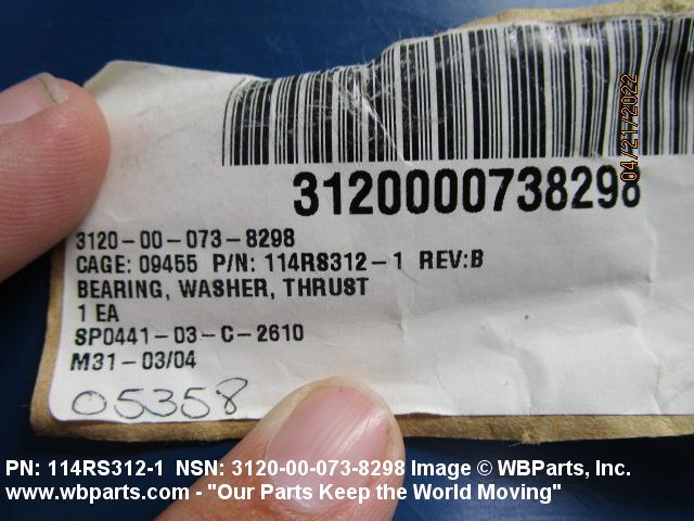 3120-00-073-8298 An item of any peripheral shape usually having one flat or spherical surface and a centrally located hole. It is designed for applications involving moving (kinetic) loads. Except for items fabricated from bearing quality synthetic (plastic) or composed of multilayer material, one bearing surface must either have a specific surface finish designation of 32 microinch (0.8 micrometre) or less, arithmetical average (aa) (arithmetic mean deviation) or one of the following conditions: be lapped or ground; have visible or detectable means of lubrication; grooves, indentations; or self-lubrication. The thickness must not exceed 25 percent of the outside diameter of the shortest distance between peripheral flats (when thickness and/or outside diameter is designated as a tolerance dimension, the maximum dimension will be used to determine compliance). Excludes straight, tubular (without flange) items having a bearing surface(s) parallel to the axis of the bore only. See also WASHER, FLAT and SPACER, SLEEVE.
