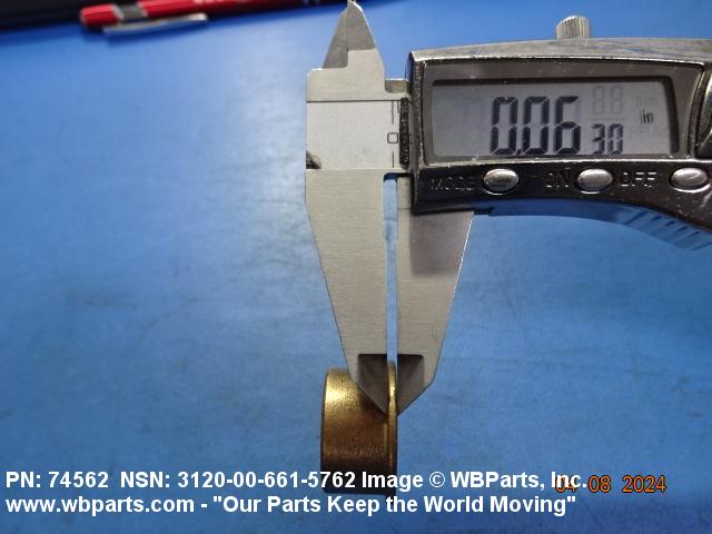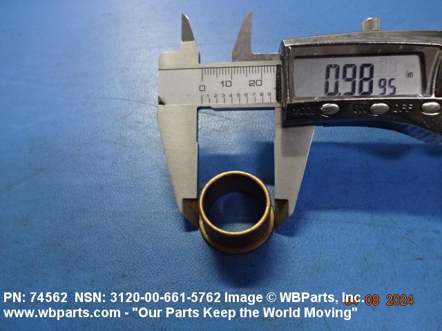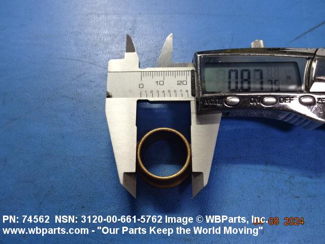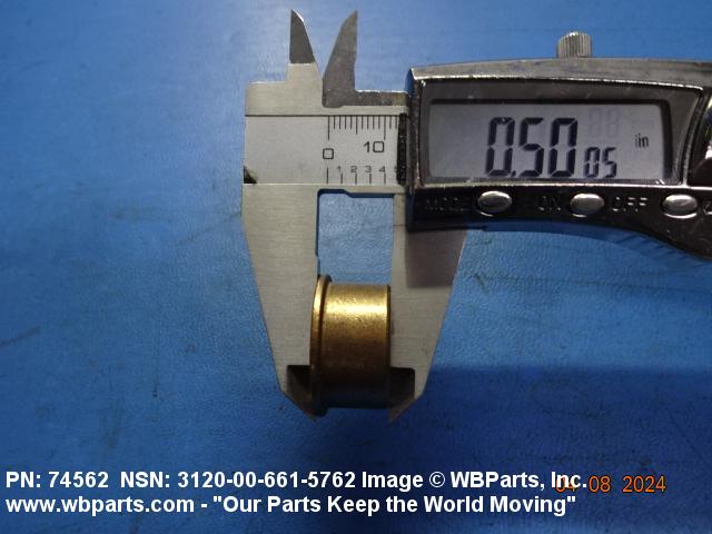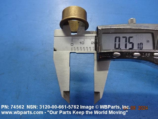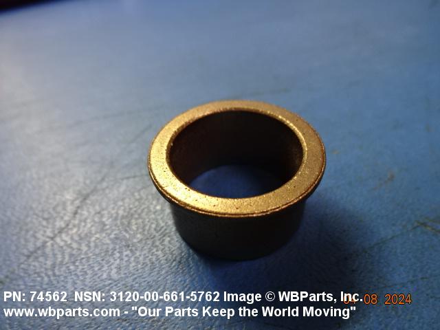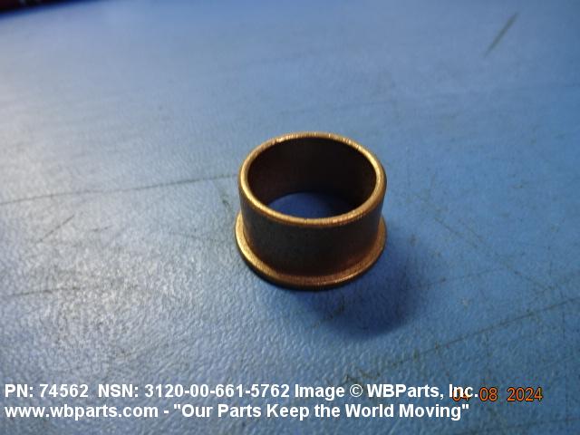 3120-00-661-5762 A tubular shaped item with or without flange(s) designed to reduce friction and carry a kinetic load on the surface(s) parallel to the axis of the bore. It must have a visible or detectable means of lubrication or be self-lubricated. The over all length must exceed 25 percent of the outside diameter or the shortest distance between peripheral flats of the body, except for straight tubular (without flange or shoulder) items having a bearing surface(s) parallel to the axis of the bore only. Includes items which are divided into two or more segments which include 180 degrees (3.141 radians) or less of the bearing periphery. See also BUSHING, SLEEVE; SPACER, SLEEVE; and WASHER (as modified). Excludes PIN, HOLLOW.
