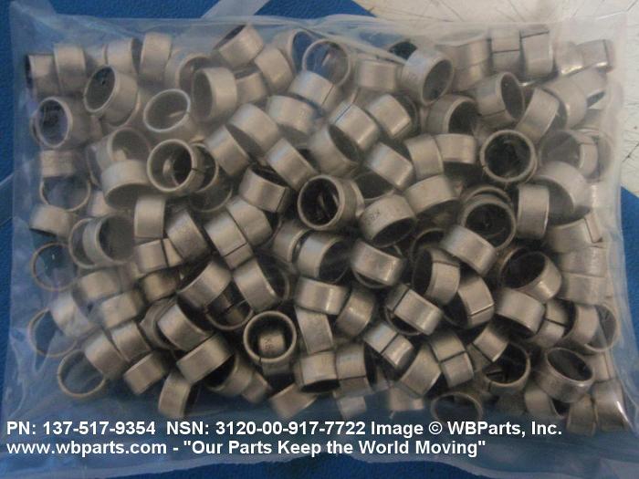 3120-00-917-7722 A tubular shaped item with or without flange(s) designed to reduce friction and carry a kinetic load on the surface(s) parallel to the axis of the bore. It must have a visible or detectable means of lubrication or be self-lubricated. The over all length must exceed 25 percent of the outside diameter or the shortest distance between peripheral flats of the body, except for straight tubular (without flange or shoulder) items having a bearing surface(s) parallel to the axis of the bore only. Includes items which are divided into two or more segments which include 180 degrees (3.141 radians) or less of the bearing periphery. See also BUSHING, SLEEVE; SPACER, SLEEVE; and WASHER (as modified). Excludes PIN, HOLLOW.