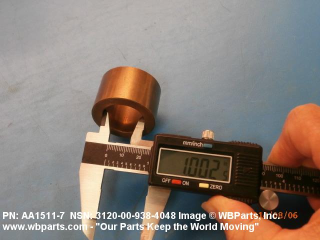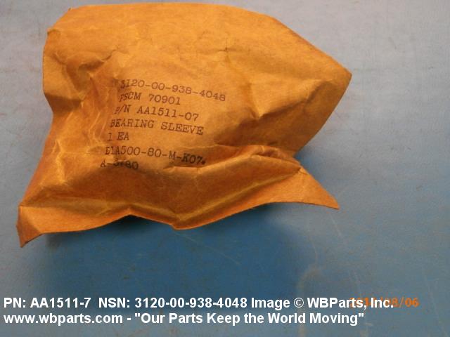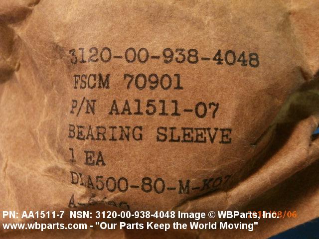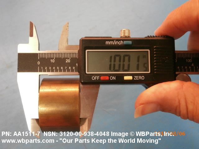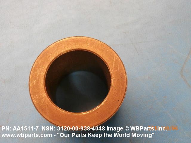 3120-00-938-4048 A tubular shaped item with or without flange(s) designed to reduce friction and carry a kinetic load on the surface(s) parallel to the axis of the bore. It must have a visible or detectable means of lubrication or be self-lubricated. The over all length must exceed 25 percent of the outside diameter or the shortest distance between peripheral flats of the body, except for straight tubular (without flange or shoulder) items having a bearing surface(s) parallel to the axis of the bore only. Includes items which are divided into two or more segments which include 180 degrees (3.141 radians) or less of the bearing periphery. See also BUSHING, SLEEVE; SPACER, SLEEVE; and WASHER (as modified). Excludes PIN, HOLLOW.
