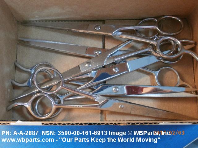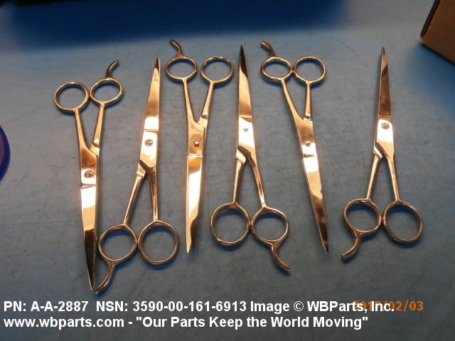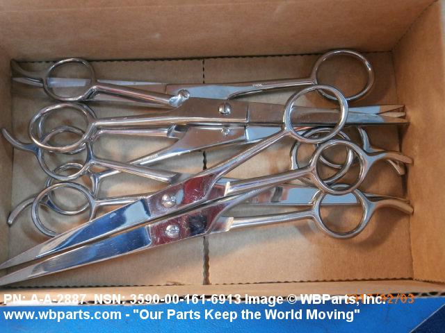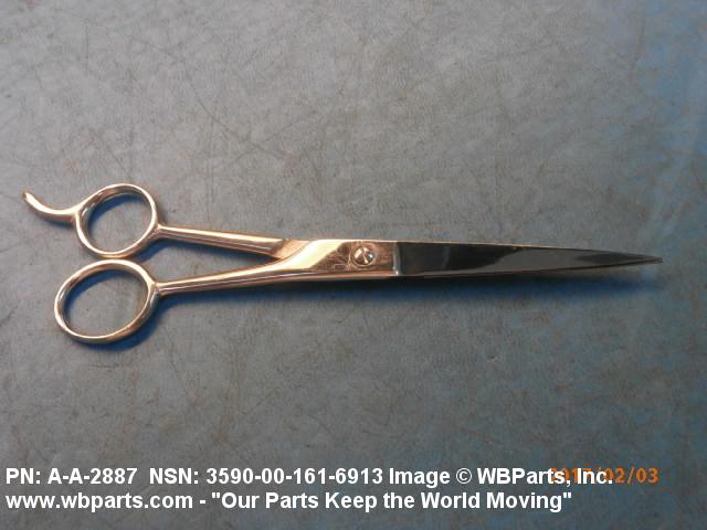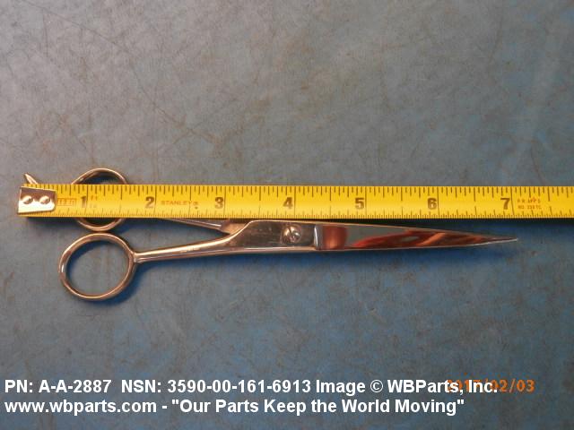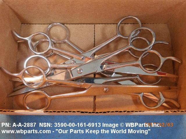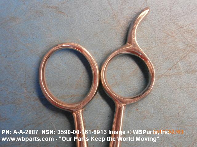 3590-00-161-6913 Shears with either two sharp pointed blades or two blunt pointed blades. The item has two ring shaped grips with finger rest, each of which is designed for a single finger.