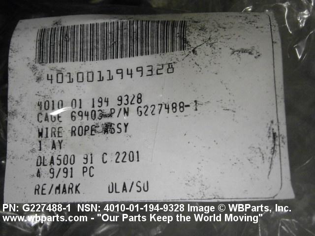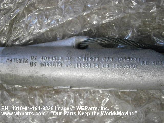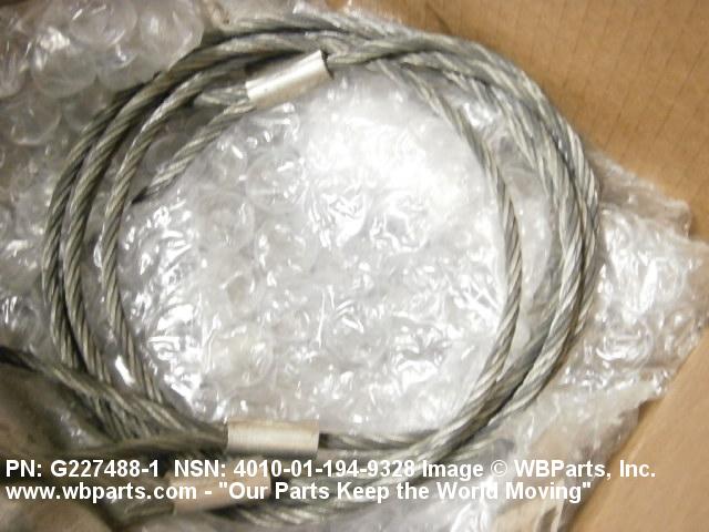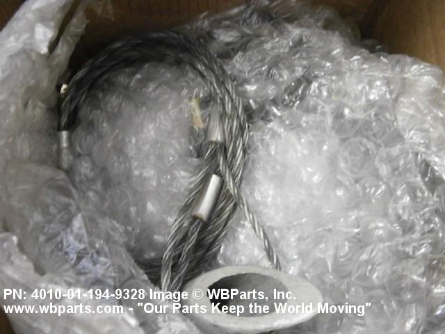 4010-01-194-9328 An assembly consisting of wire rope, with terminal attachment(s) and/or end loop(s), in a continuous run from end to end. (If without attachments, one end must terminate in a loop.) It may contain one or more intermediate and/or end attachments such as sliding or fixed ring(s), hook(s), or the like. For items specifically designed for aviation, see WIRE ROPE ASSEMBLY, SINGLE LEG, AVIATION. Excludes CONTROL ASSEMBLY, PUSH-PULL.