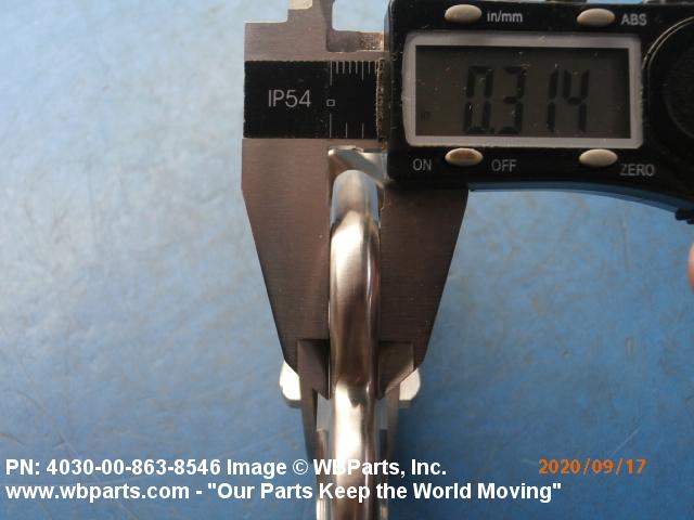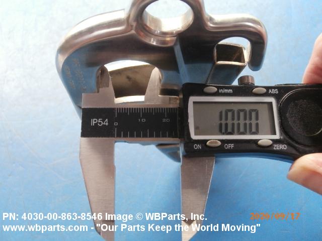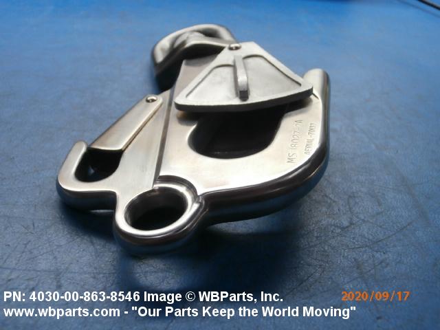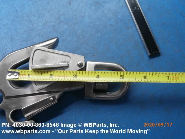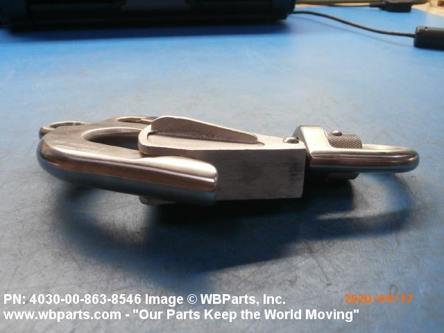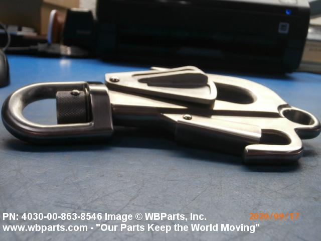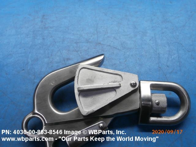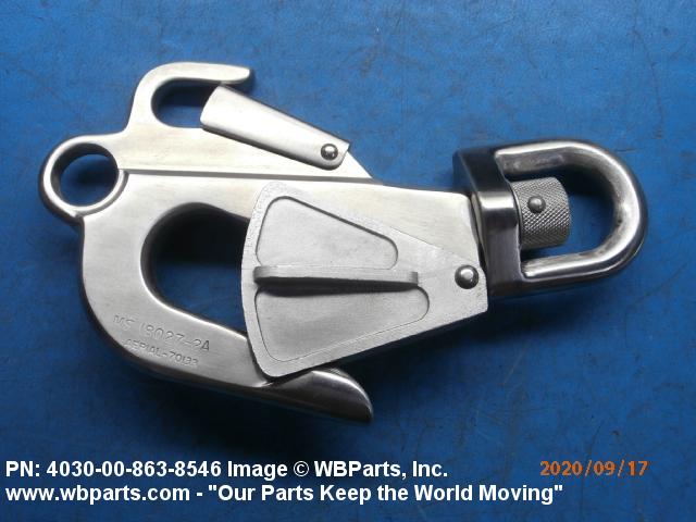 4030-00-863-8546 A metal hook with a hinged point and with a sliding link, ring, bail, or similar locking device, to secure the point to the body in order to close the throat. The body may be designed of a single piece or it may consist of link(s). When desired, the point may be released to swing outward, thereby freeing the engaged item(s). Excludes HOOK, RELEASE.