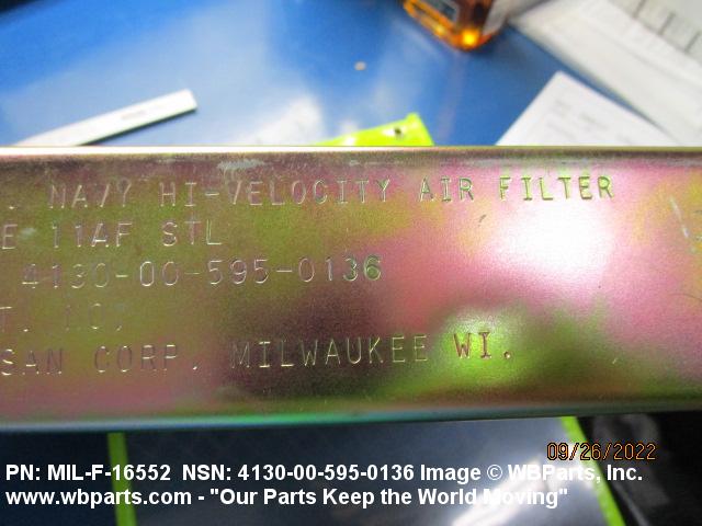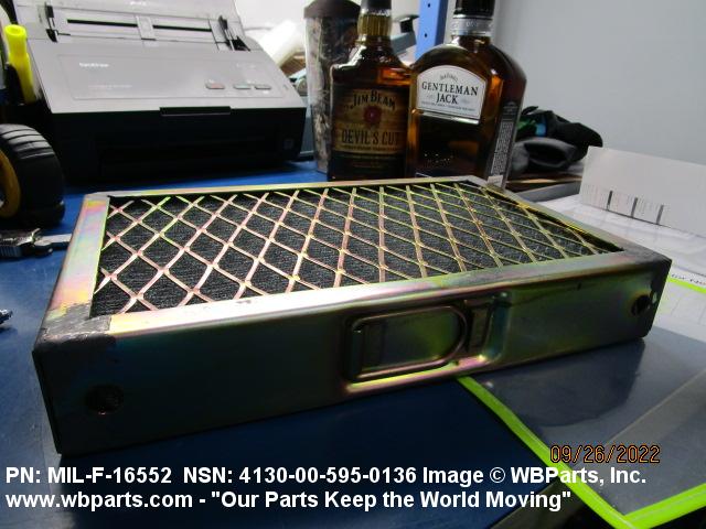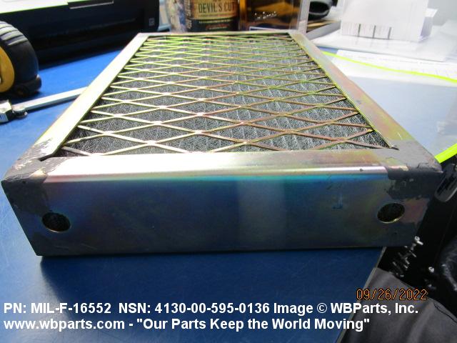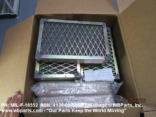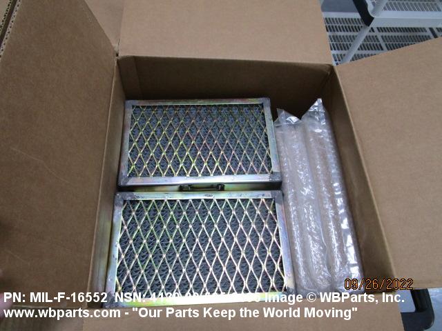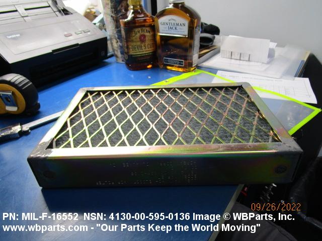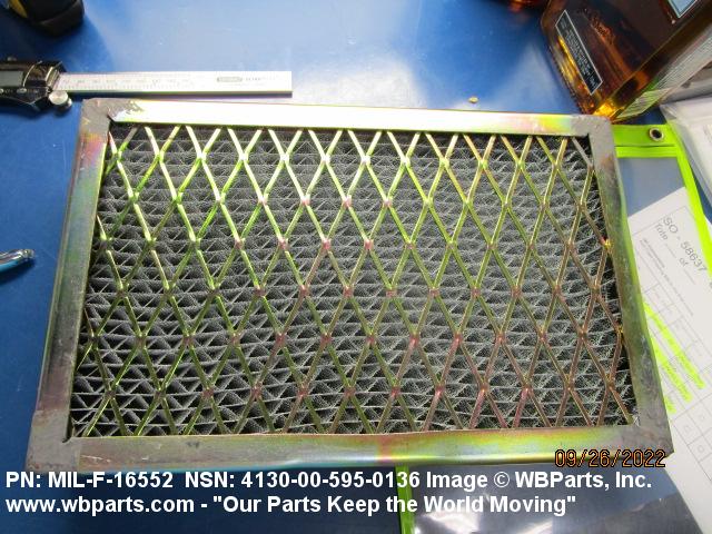 4130-00-640-0240 A replaceable device designed to remove dust, pollen or other foreign matter from the air passing through it. The removal of particles is accomplished by porous fibrous or shredded material (metallic or nonmetallic) which is loosely woven or matted and confined in a frame or retained between perforated sheets of firmer material. It is designed to fit into air conditioners, ventilation systems and hot air furnaces. It may have facilities for radio frequency/electromagnetic interference shielding. The filter may be cleaned by the use of compressed air, blown through the filter element, or by using water and a suitable detergent for cleaning purposes which would extend the life of the filter.20216600062Aircraft Air Conditioning, Heating, and Pressurizing Equipment41300045Refrigeration and Air Conditioning Components