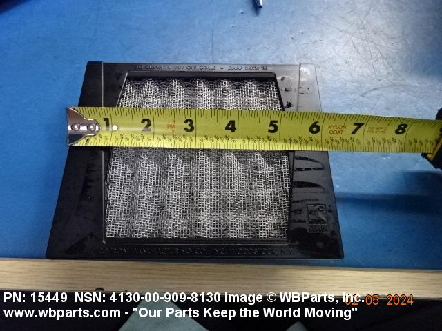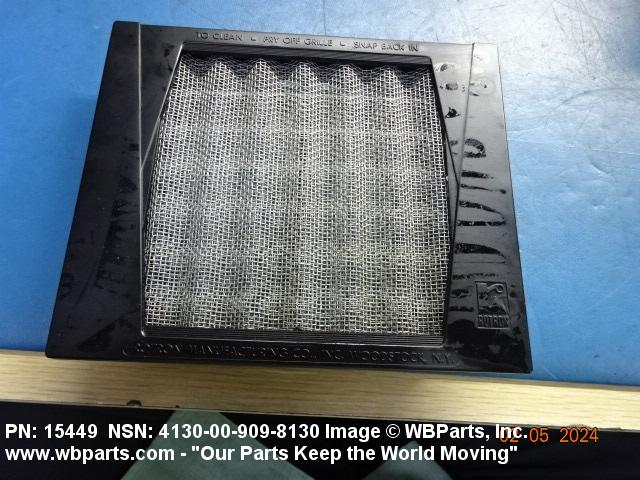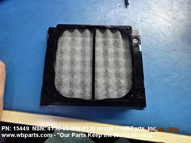 4130-00-909-8130 A replaceable device designed to remove dust, pollen or other foreign matter from the air passing through it. The removal of particles is accomplished by porous fibrous or shredded material (metallic or nonmetallic) which is loosely woven or matted and confined in a frame or retained between perforated sheets of firmer material. It is designed to fit into air conditioners, ventilation systems and hot air furnaces. It may have facilities for radio frequency/electromagnetic interference shielding. The filter may be cleaned by the use of compressed air, blown through the filter element, or by using water and a suitable detergent for cleaning purposes which would extend the life of the filter.20216600062Aircraft Air Conditioning, Heating, and Pressurizing Equipment41300045Refrigeration and Air Conditioning Components