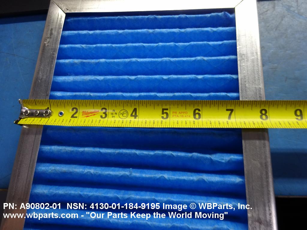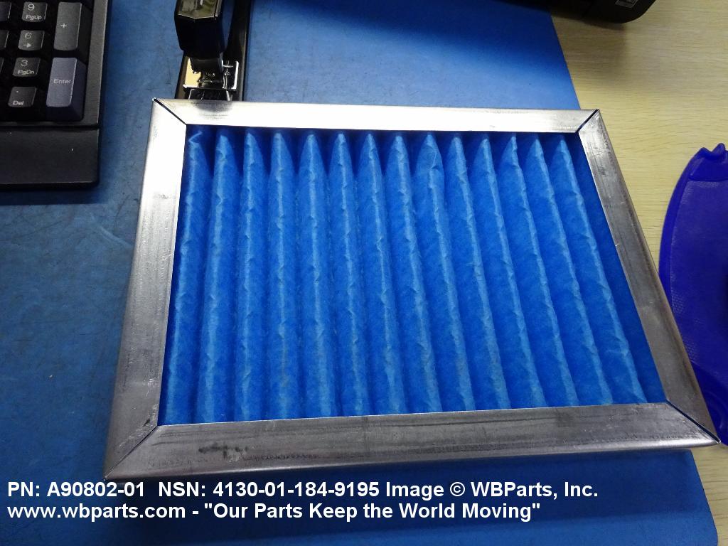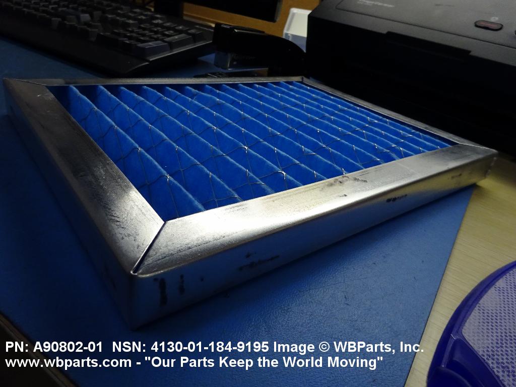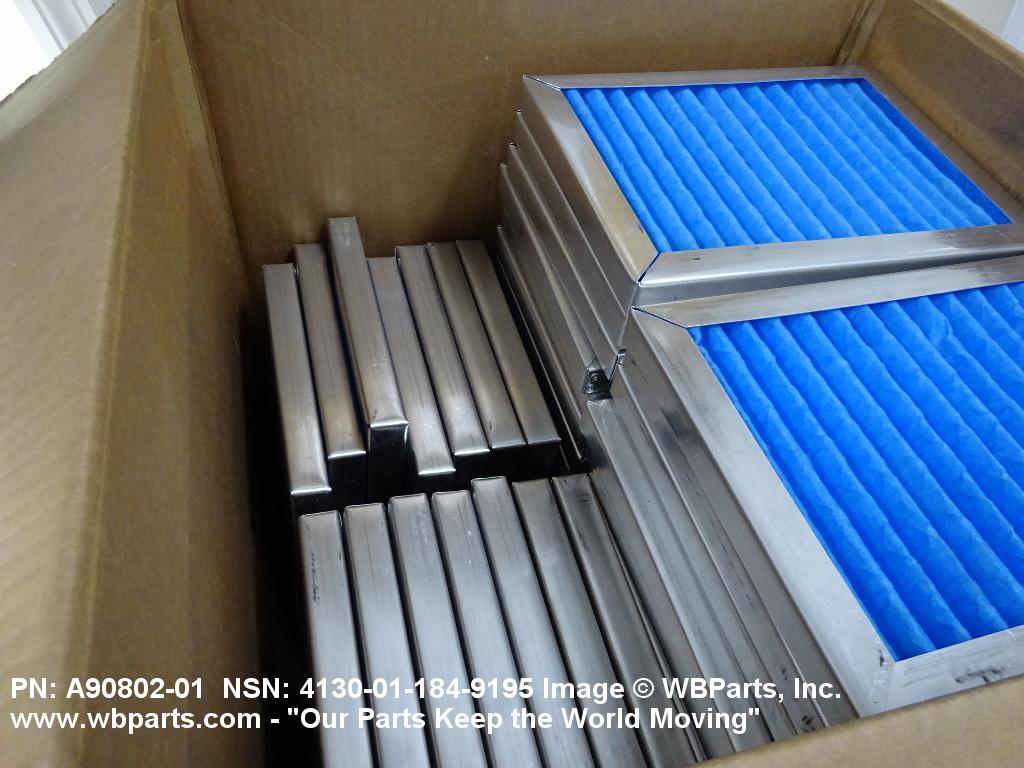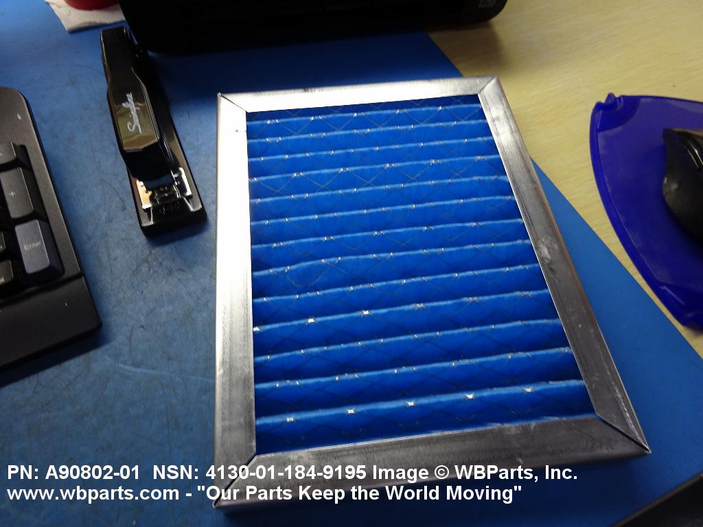 4130-01-184-9195 A replaceable device designed to remove dust, pollen or other foreign matter from the air passing through it. The removal of particles is accomplished by porous fibrous or shredded material (metallic or nonmetallic) which is loosely woven or matted and confined in a frame or retained between perforated sheets of firmer material. It is designed to fit into air conditioners, ventilation systems and hot air furnaces. It may have facilities for radio frequency/electromagnetic interference shielding. The filter may be cleaned by the use of compressed air, blown through the filter element, or by using water and a suitable detergent for cleaning purposes which would extend the life of the filter.20216600062Aircraft Air Conditioning, Heating, and Pressurizing Equipment41300045Refrigeration and Air Conditioning Components