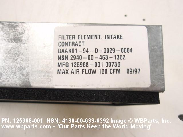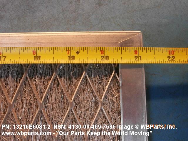 4130-01-295-8192 A replaceable device designed to remove dust, pollen or other foreign matter from the air passing through it. The removal of particles is accomplished by porous fibrous or shredded material (metallic or nonmetallic) which is loosely woven or matted and confined in a frame or retained between perforated sheets of firmer material. It is designed to fit into air conditioners, ventilation systems and hot air furnaces. It may have facilities for radio frequency/electromagnetic interference shielding. The filter may be cleaned by the use of compressed air, blown through the filter element, or by using water and a suitable detergent for cleaning purposes which would extend the life of the filter.20216600062Aircraft Air Conditioning, Heating, and Pressurizing Equipment41300045Refrigeration and Air Conditioning Components